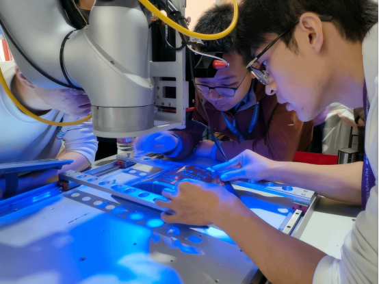 “我们尝试了多种算法和控制策略,经历了无数次失败。”李国豪回忆,“最终通过将机器人运动学算法与视觉识别技术结合,实现了0.01mm级的定位精度,满足了精密电子元件的焊接需求。”攻关过程中,张聪在技术层面倾囊相授,为团队破解算法优化、设备调试等关键难题,推动团队承接对外技术服务业务,促成校企合作落地。