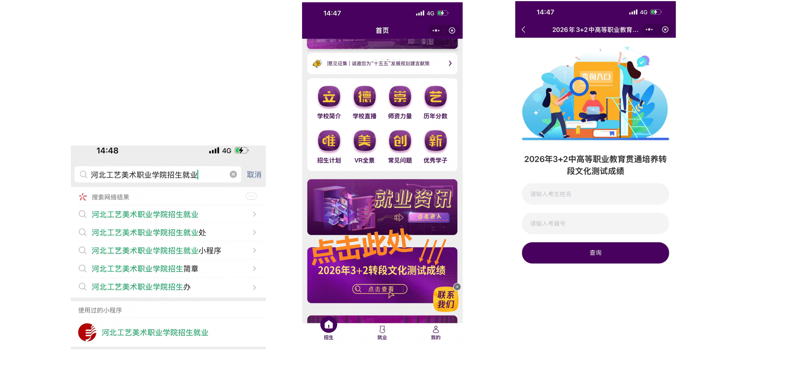 📢 2026年河北工艺美术职业学院3+2转段文化测试成绩已公布,查询指南如下1. 打开微信,搜索并进入小程序“河北工艺美术职业学院招生就业”2. 首页找到并点击“2026年3+2转段文化测试成绩”入口3. 输入考生姓名和考籍号,提交即可查询成绩⚠️ 提示:若遇小程序访问或查询异常,可联系中职学校招生就业处协助查询。