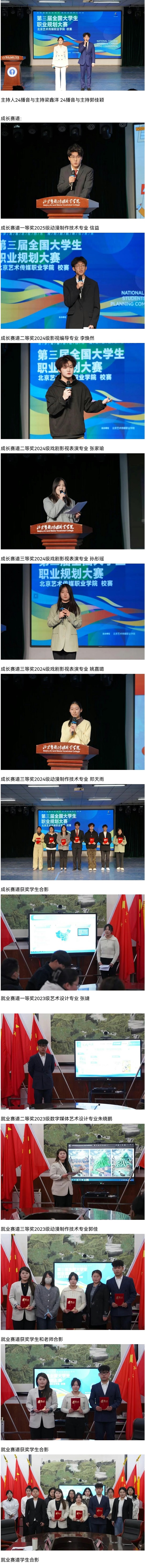 经过多轮激烈角逐,大赛最终评选出成长赛道7名获奖学生、就业赛道3名获奖学生。成长赛道,一等奖2025级动漫制作技术专业的信益,二等奖2024级戏剧影视编导专业的李焕然;2024级影视编导专业的张家瑜,三等奖2024级戏剧影视表演专业的孙彤瑶;2024级文物修复与保护专业的吴奕彤;2024级戏剧影视表演专业的姚嘉璐;2024级动漫制作设计专业的郑天雨。就业赛道,一等奖2023级艺术设计专业的张婕,二等奖2023级数字媒体艺术设计专业的朱晓鹏,三等奖2023级动漫制作技术专业的郭佳。获奖选手将代表学校参加北京市赛的角逐,学院也将为其提供专业指导,助力其在更高舞台展现北艺传媒学子的风采。