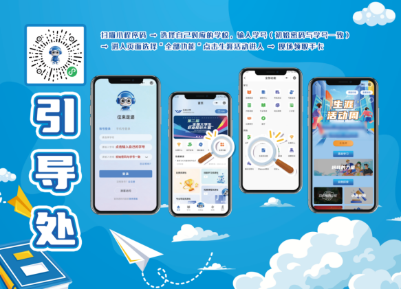学生在引导处登录【位来足迹】小程序后,领取定制的生涯体验手卡后(一人一卡),进入活动区域开始闯关,每通过一个关卡收集对应关卡的印章,印章集齐且足迹平台内的所有关卡完成打卡后,填写调查问卷并在领奖处进行抽奖(抽到参与奖的同学也会有礼品哦!)