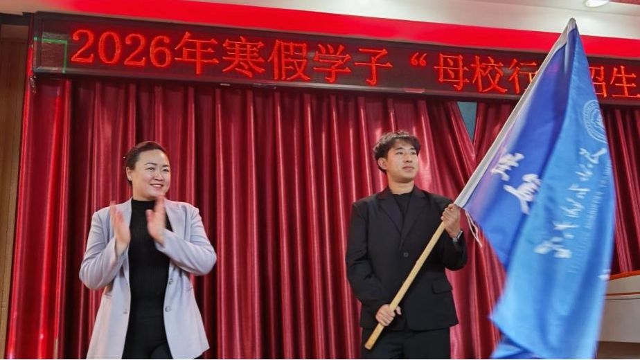 施洋为2026年寒假学子“母校行”招生宣传实践活动学生代表授旗。