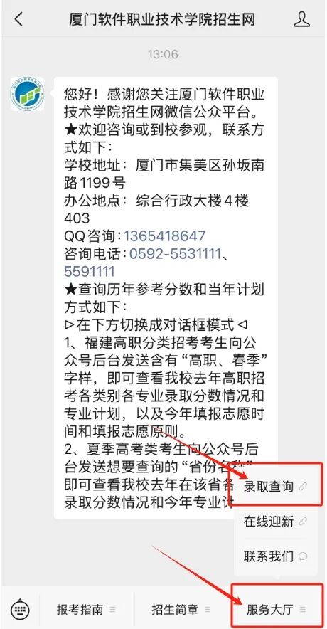 关注公众号后,点击右下角服务大厅,然后点击录取查询。
