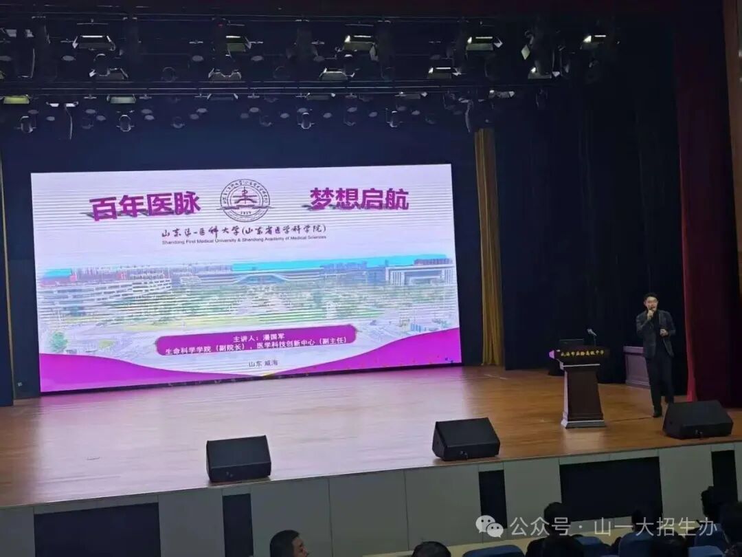 11月13日至14日,由威海市教育局主办的“相约名校·筑梦启航”全国知名高校进高中活动圆满落幕。生命科学学院副院长潘国军、系主任洒荣波携最新招生政策、医学专业优势及成才路径,先后走进威海市实验高级中学、荣成一中、文登一中、乳山一中四所重点高中,与千余名考生及家长面对面交流,为大家搭建起“零距离”了解山东第一医科大学升学的桥梁。 宣讲活动现场,潘国军围绕山东第一医科大学的办学特色、学科优势、师资力量等方面展开详细介绍。针对“医学类专业分数参考”“志愿填报策略”“转专业政策”等高频问题,潘国军副院长逐条解释,并结合往年招生数据,为考生提前规划升学方向、科学填报志愿提供了极具实操性的指导建议。