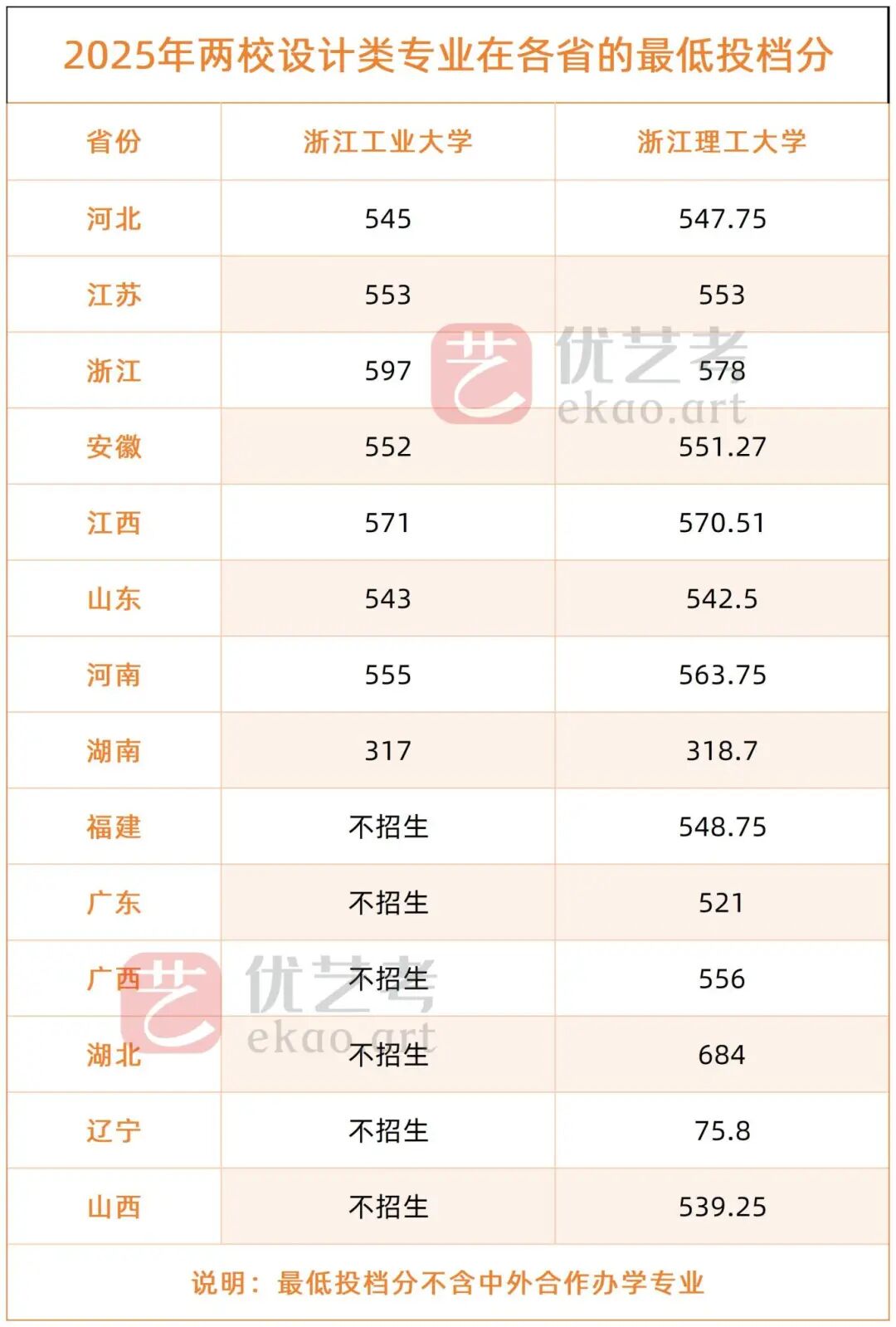 优艺考整理了两校的设计学专业在各省的最低投档分数据,发现两校除了在本省的投档分数差距较大外,在其他省份的投档分数基本一致,主要是因为浙江省内好大学较少,中高分数段考生出省学习的意愿度较低,再加上浙江工业大学“冲一流”势头较猛,导致省内报考竞争激烈。