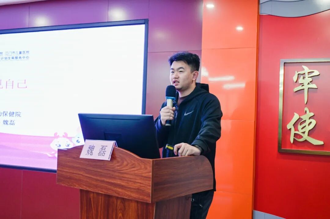 紧接着,江门市妇幼保健院心理科心理治疗师魏磊带来了题为《愈见自己》的专题讲座。他结合真实案例,运用有奖问答、情景模拟等互动形式,深入浅出地讲解了正常与异常情绪反应的识别方法,并分享了实用的情绪调节技巧,引导学生关注心理健康、学会自我调适。