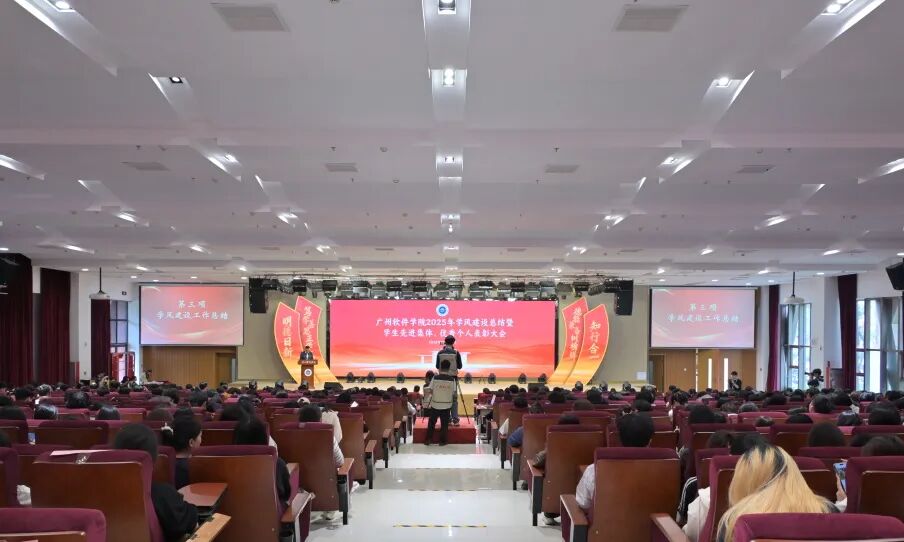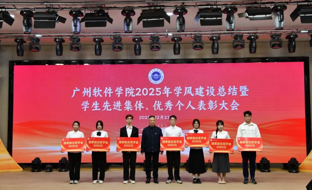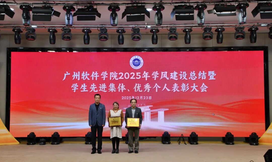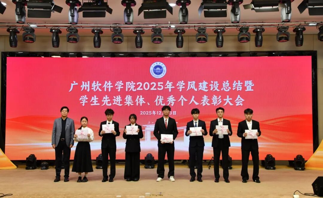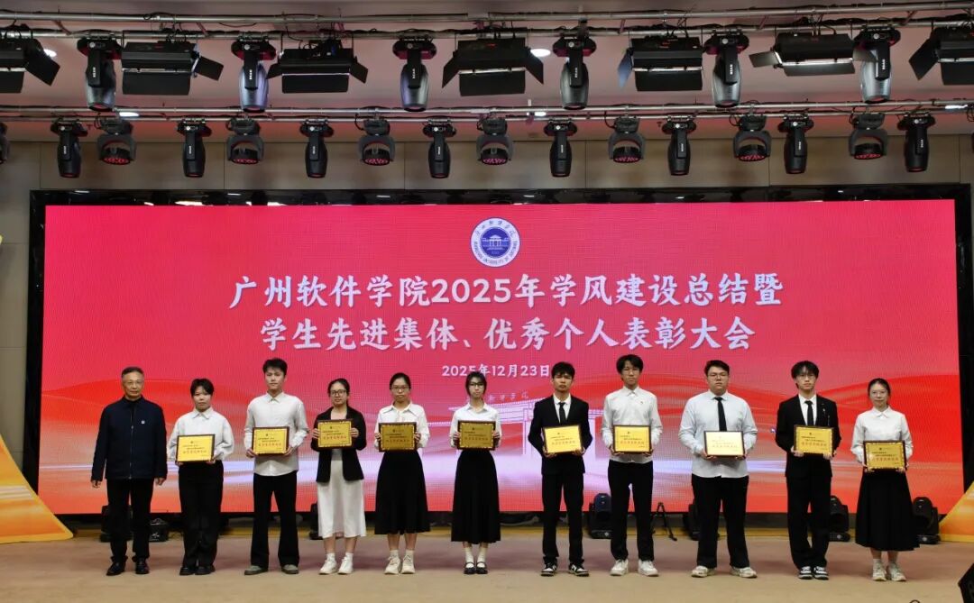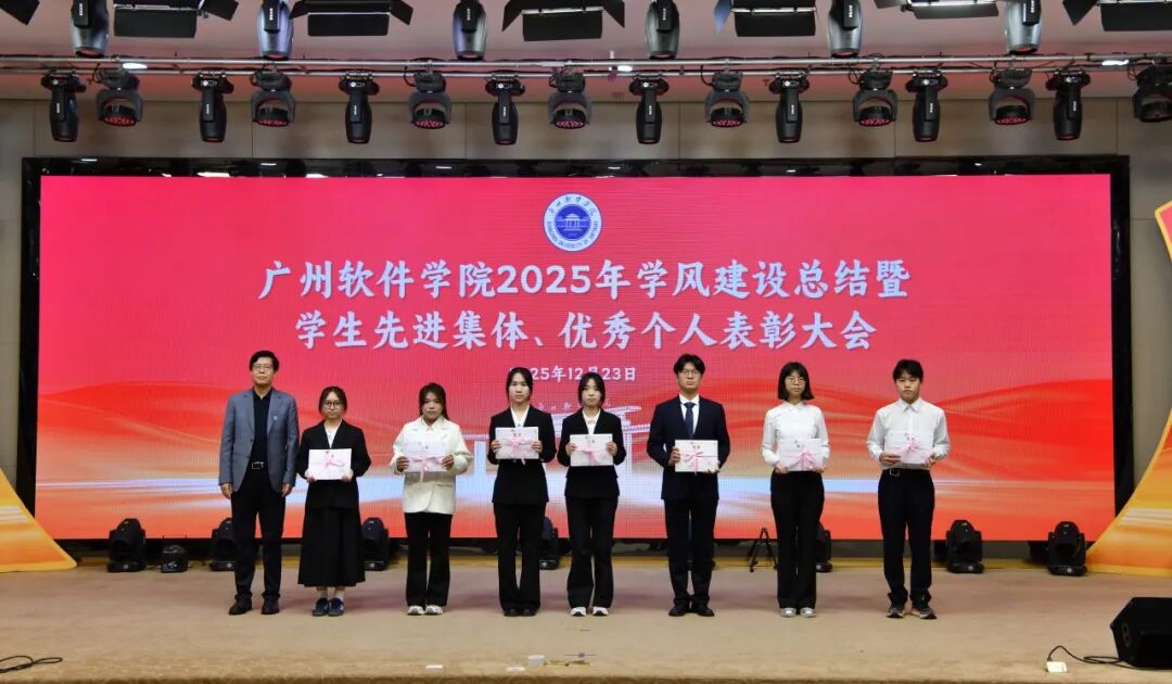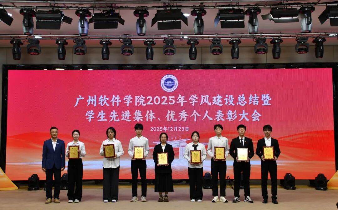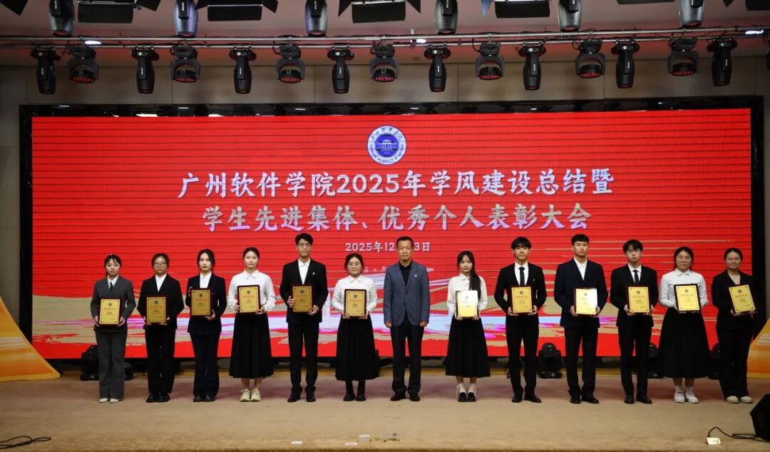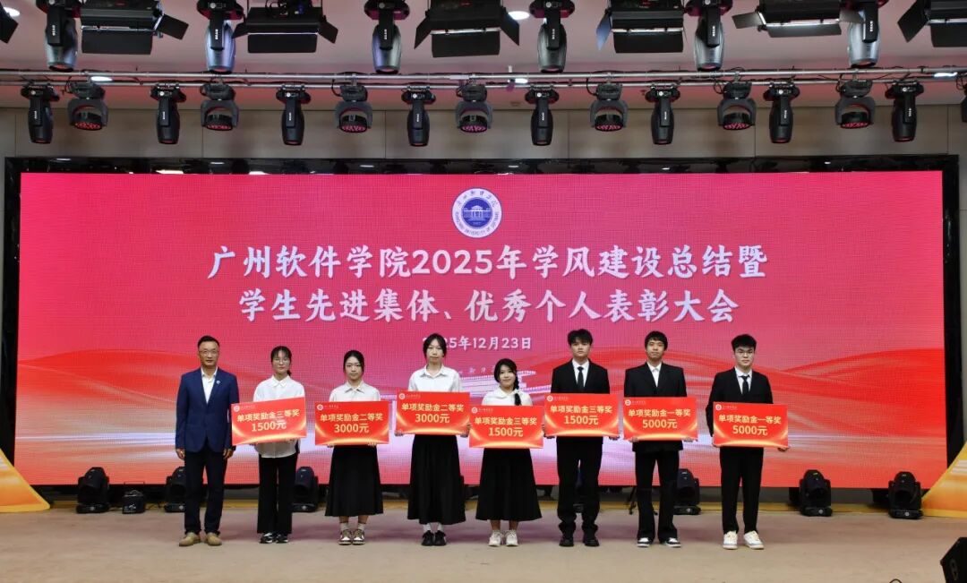 岁末收官,硕果盈枝。12月23日下午,广州软件学院在学术报告厅隆重召开“笃学善思正学风,德能兼备树榜样”2025年学风建设总结暨学生先进集体、优秀个人表彰大会。大会旨在总结年度学风建设成果,表彰先进,树立榜样,激励全体师生在新征程上奋发有为。学校校长张强,副校长徐祥、曹广福,党委副书记张广金出席大会。相关行政教辅部门主管、各二级学院党政领导、专业教师、辅导员代表及获奖学生代表参会。大会由学生处处长陈石宇主持。