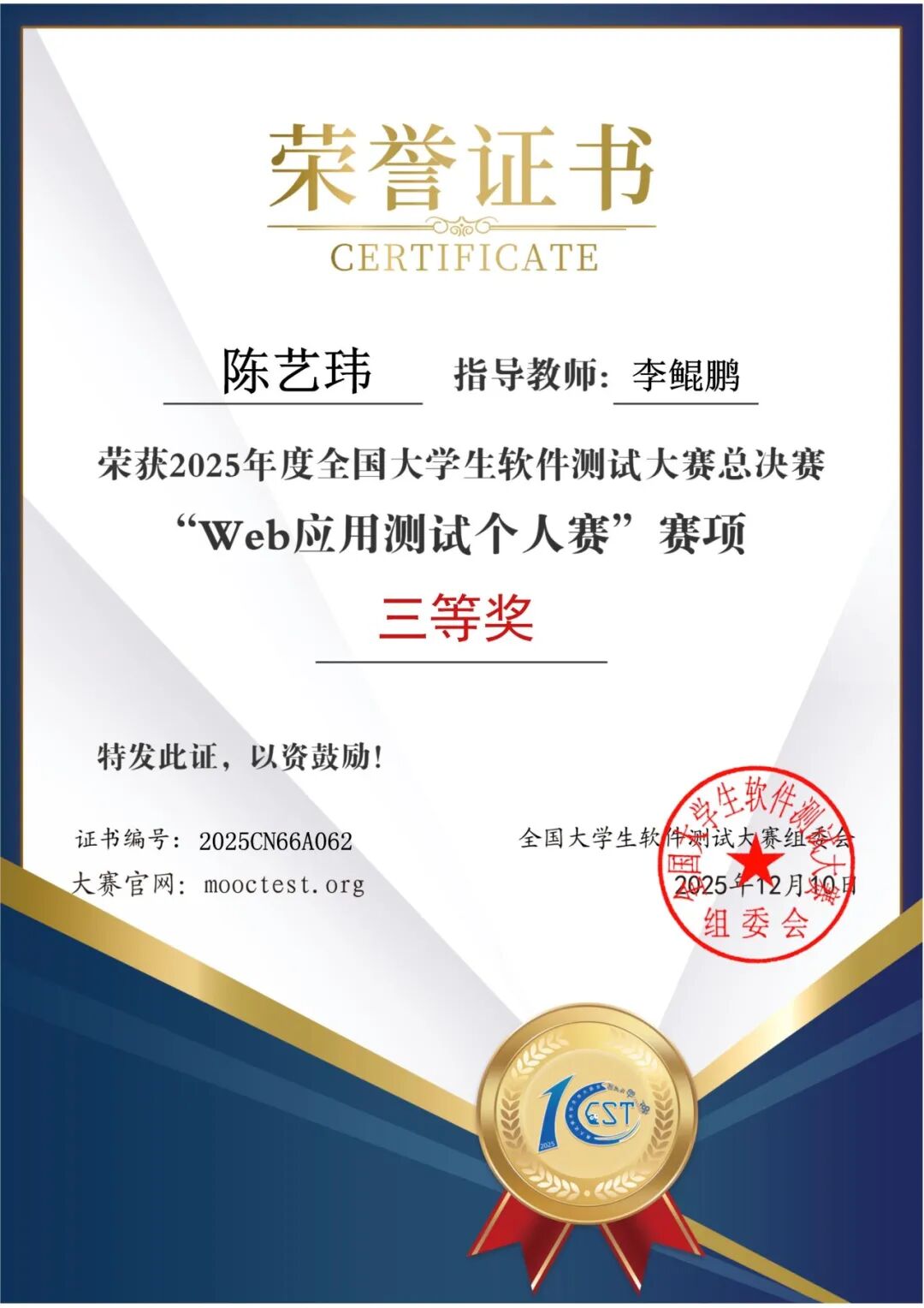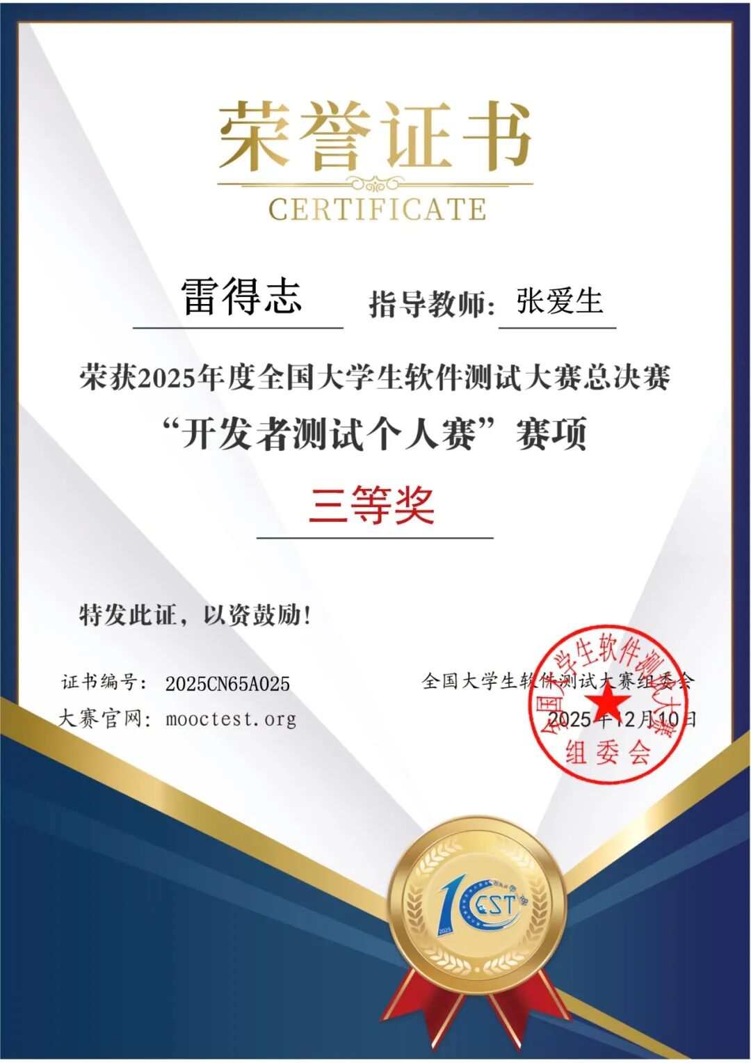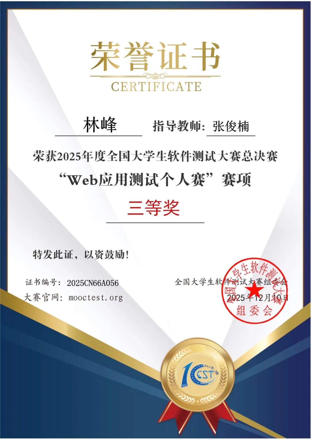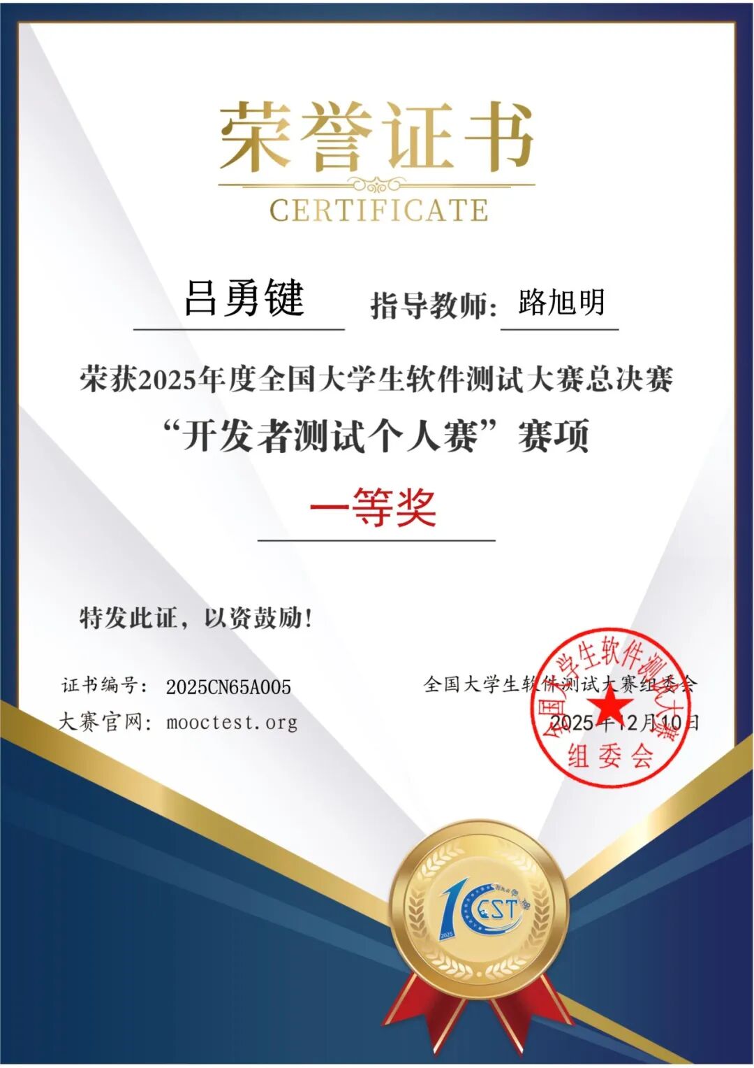 国赛一等奖获得者、网络空间安全学院24级信息管理与信息系统1班吕勇键同学表示:“此次比赛最大的收获在于思维模式的转变。从‘创造者’到‘质检员’视角的切换,深刻体会到了软件质量保障的重要性。”软件测试并非简单的“点点点”,而是一门需要缜密逻辑的技术艺术。参加此类大赛,能极大地反哺编程思维,帮助成为更全面的技术人才。