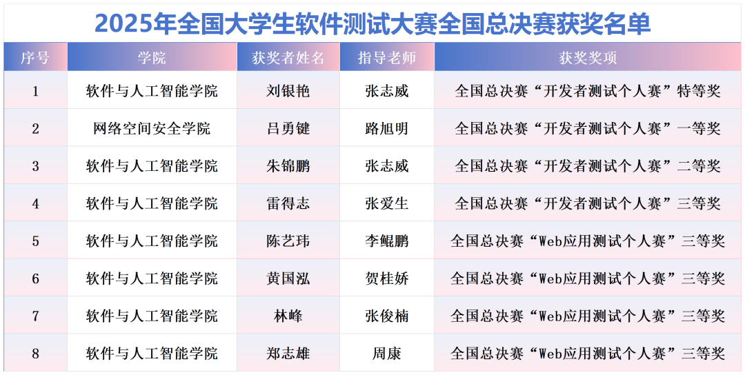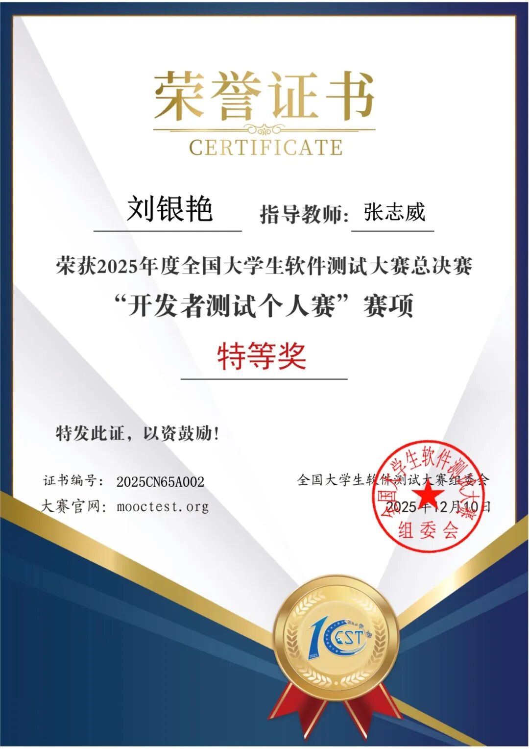 近日,2025年全国大学生软件测试大赛全国总决赛在南京大学(鼓楼校区)与金陵科技学院(江宁校区)两个赛点圆满落幕。经过激烈角逐,我校学子表现卓越,共斩获全国特等奖1项、一等奖1项、二等奖1项、三等奖5项。创造了我校自2023年参加该项赛事以来的历史最好成绩,实现了奖项等级与数量的双重突破!