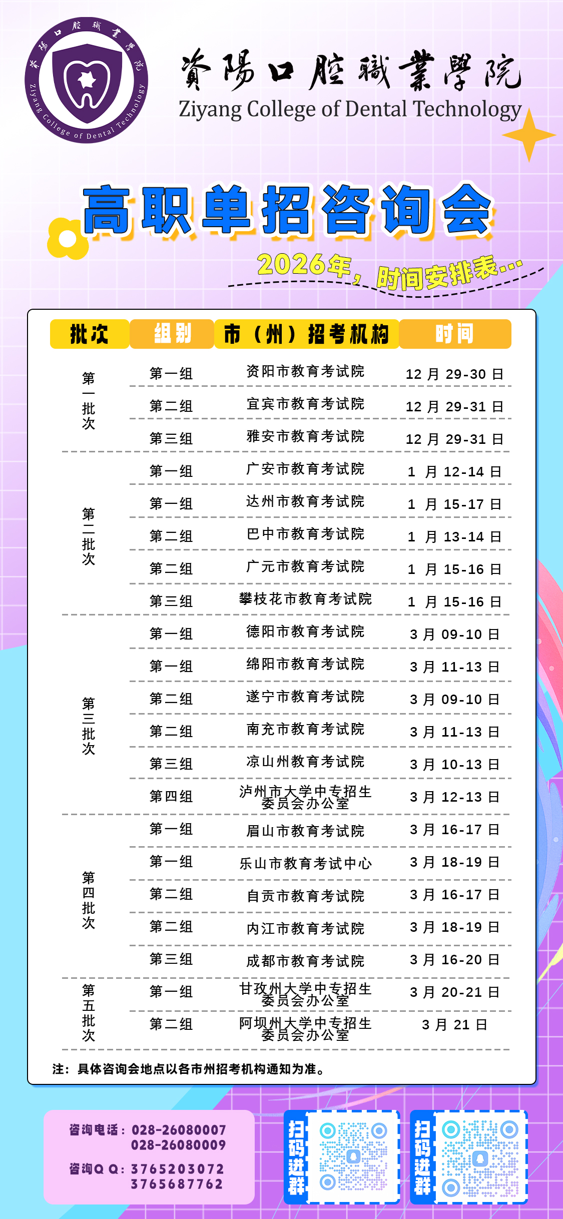 按照四川省教育厅和四川省教育考试院的工作安排,四川省招生考试指导中心将牵头举办我省2026年高等职业教育单独考试招生咨询会,具体安排如下:
