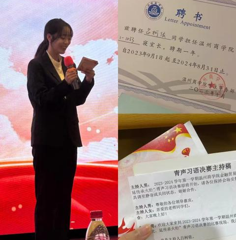 在温商院的这段时光,是吕柯依不断突破自我的成长旅程。学校提供的广阔平台、老师们的专业指引与同学们的并肩支持,为她的学业深耕、思想成长与实践探索筑牢了根基。这些实实在在的助力,让她得以在专业学习中精进、在各类实践中锤炼,一步步朝着目标稳步前行,也让她更加坚定地在逐梦路上继续奋进。
