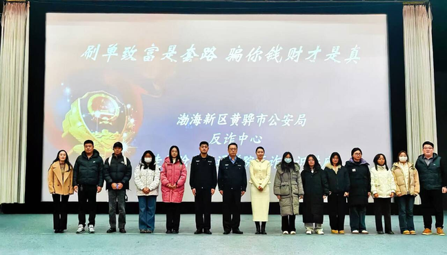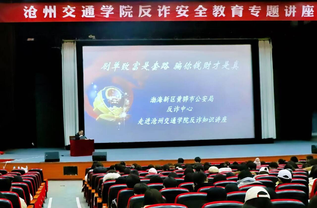 为切实筑牢校园安全防线,提升广大师生防范电信网络诈骗的意识和能力,12月24日,我校举办反诈安全教育专题讲座。副校长王忆宁出席活动,安全保卫处、学生处负责人,全体辅导员,学生党员、学生干部及学生代表等参加讲座。本次讲座特邀渤海新区黄骅市公安局反诈中心主任孙涛、民警胡博程担任主讲。