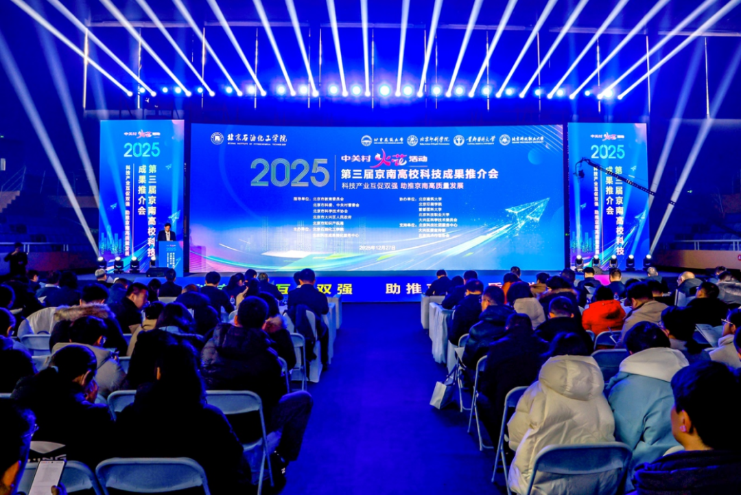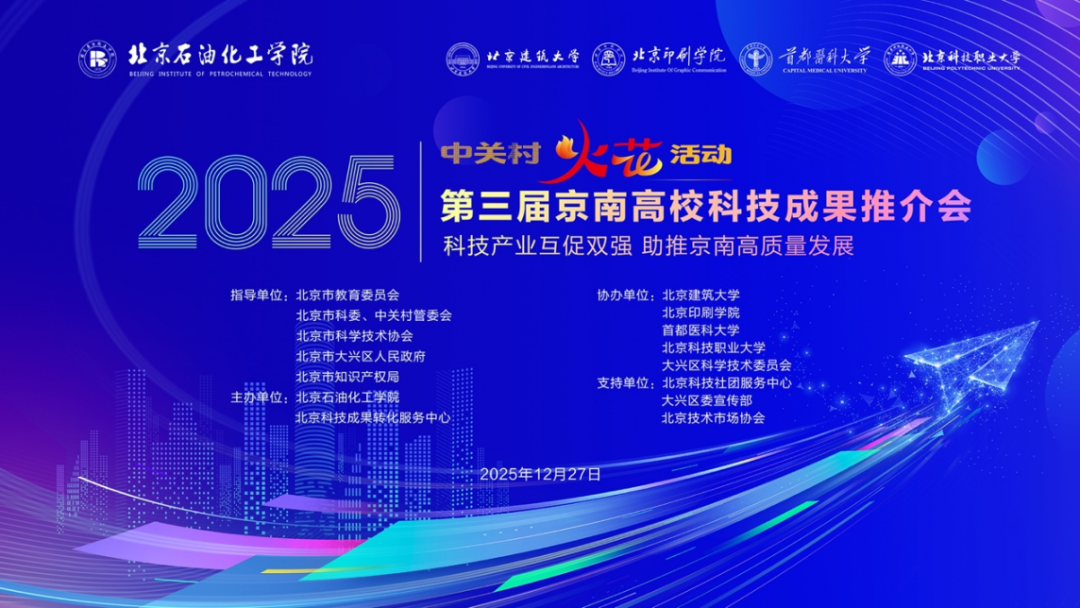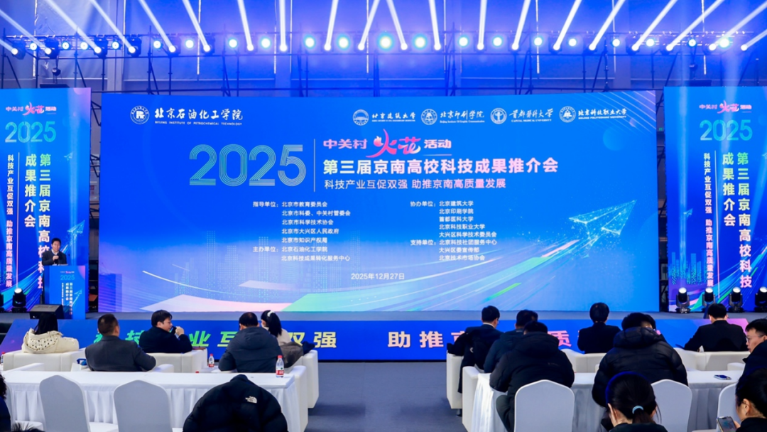 12月27日,由北京石油化工学院、北京科技成果转化服务中心共同主办,北京建筑大学、北京印刷学院、首都医科大学、北京科技职业大学、大兴区科学技术委员会联合协办的2025第三届京南高校科技成果推介会在北石化体育馆成功举办。本届推介会以“科技产业互促双强,助推京南高质量发展”为主题,来自北京市相关委办局、京南五所高校、大兴区相关部门、京津冀相关行业企业、校友企业、投融资机构和成果转化服务机构等400余人,齐聚一堂,共话成果转化。同时,京南五所高校的科技创新成果,以推介、展览、路演等多种方式进行公开展示。