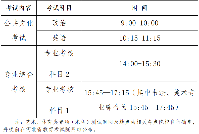 (二)考试(考核)说明及招生计划查询 公共文化考试、专业综合考核说明已公布,可点击查询。 请于2026年3月1日前,登录河北省教育考试院网站查询2026年河北省普通专升本分校分专业招生计划(普通考生类)及《2026年普通专升本考试本专科专业(类)对照表》。面向原建档立卡贫困家庭应届高职(专科)毕业生及退役大学生士兵考生的两个专项招生计划,拟于2026年5月中下旬另行公布。 (三)考试时间 考试将于2026年4月18日举行,具体安排如下: