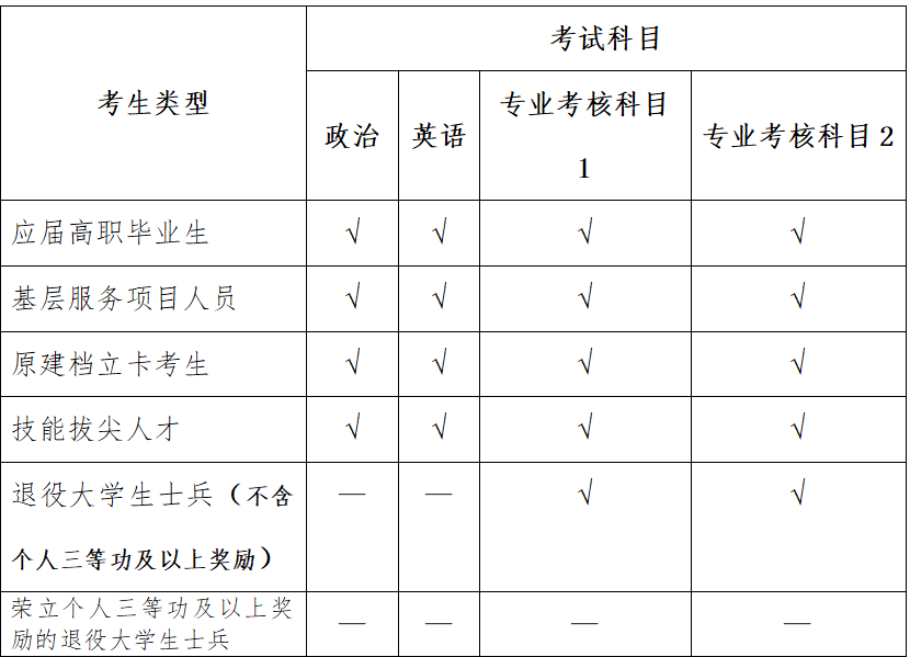 2026年河北省普通高等学校专升本(以下简称普通专升本)考试将于2026年4月18日举行。现将有关事项公告如下: 一、招生对象 (一)应届高职(专科)毕业生 河北省内按国家招生计划招收入学的普通高校2026年应届高职(专科)毕业生。 (二)基层服务项目人员 我省普通高校高职(专科)毕业生参加大学生村官、农村教师特岗计划、“三支一扶”计划、志愿服务西部计划等基层服务项目人员服务期满(考核合格)3年内,未落实就业单位的,可以按照应届高职(专科)毕业生待遇报考且只能报考一次。 (三)原建档立卡贫困家庭应届高职(专科)毕业生 河北省内按国家招生计划招收入学的原建档立卡贫困家庭普通高校2026年应届高职(专科)毕业生。继续面向原建档立卡贫困家庭高职(专科)毕业生设立专项计划,采取计划单列、自愿报名、统一考试、单独录取的办法,考生可根据自己意愿选择报考“专升本专项计划”。 (四)退役大学生士兵 应征入伍地为河北省,满足以下两种情形之一的服义务兵役后退役普通高校大学生士兵(不含直招士官入伍的退役军人):入伍时为普通高职(专科)院校新生或在校生,退役后复学完成高职(专科)学业的2026年普通应届毕业生;退役前已取得国家承认的普通全日制高职(专科)学历的2025年度退役大学生士兵(已报考过2025年普通专升本考试的退役大学生士兵除外)及2026年春季退役的大学生士兵(已取得退役证)。其中,符合条件的2026年春季退役大学生士兵可根据自己实际情况,自主选择参加2026年或2027年普通专升本,且仅可参加一次。根据应征入伍退役大学生士兵规模足额安排招生计划。对录取后未报到、自行放弃入学资格的考生,不再享受免试专升本政策。 (五)技能拔尖人才 河北省内按国家招生计划招收入学的普通高校2026年应届高职(专科)毕业生且获得教育部主办的世界职业院校技能大赛争夺赛(高职组)金奖和银奖、中国国际大学生创新大赛金奖和银奖,以及全国大学生职业规划大赛国赛金奖和银奖者,实行计划单列,单独录取。考生报名参加考试后可向我省一所职业本科高校提出申请,经申请的职业本科高校进行资格审核后,由学校直接录取,报河北省教育考试院备案。 二、报名时间及流程 按照《河北省教育厅关于优化调整河北省普通专升本考试科类及科目设置的通知》(冀教学〔2023〕19 号)要求,所有考生报考的本科专业应与专科(高职)专业大体对应。河北省教育考试院将在《普通专升本考试本专科专业(类)对照表》(上述通知附件1)基础上,结合2026年招生专业新增、停招及中医学、针灸推拿学、康复治疗学本专对应关系调整情况,公布《2026年普通专升本考试本专科专业(类)对照表》(拟与2026年普通考生类招生计划同步公布)。 各类考生应根据自身情况,遵循相应报名流程填报信息,选择报考专业。网上缴费前,考生可自行修改相关报考信息。已完成网上缴费的,报名费不予退还;未完成网上缴费的,报名无效。 (一)应届高职(专科)毕业生、技能拔尖人才考生 1.时间安排 2026年3月4日9时至16日17时完成网上注册及信息填报,并进行网上缴费。 2.报名流程 请考生在规定时间内,登录河北省教育考试院网站(www.hebeea.edu.cn),点击首页“普通专升本信息服务”进入河北省普通专升本考试管理系统(以下简称“系统”,下同),使用本人身份证号进行注册,核对本人学籍信息(如信息有误,可在系统内向生源学校提出变更申请),选择报考专业及考区,并填报其他相关信息,进行网上缴费。 (二)基层服务项目人员、原建档立卡贫困家庭应届高职(专科)毕业生、退役大学生士兵考生 1.时间安排 第一阶段:3月4日9时至8日17时完成网上注册及信息填报,等待资格审核。 第二阶段:3月11日17时后登录系统查询资格审核结果,通过的须于16日17时前进行网上缴费;未通过的,须于16日17时前按系统提示补充材料或修改相关信息。 2.报名流程 请考生在规定时间内,登录河北省教育考试院网站(www.hebeea.edu.cn),点击首页“普通专升本信息服务”进入系统,使用本人身份证号进行注册,填报相关信息,上传规定的相关材料。通过资格审核后,可进行网上缴费,涉及考生身份(资格)的相关信息不得再进行修改;需要补充材料的,请按系统提示予以补充或修改。 3.材料上传要求 (1)基层服务项目人员,须上传考生本人身份证、教育部学历证书电子注册备案表、相关基层项目服务期满合格证书等佐证材料照片。 (2)原建档立卡贫困家庭应届高职(专科)毕业生,须上传原建档立卡证明材料(“全国防止返贫监测和衔接推进乡村振兴信息系统”查询页面截图,打印后加盖县级及以上农业农村局或承担相应职责部门公章)照片(图示)。 (3)退役大学生士兵考生,须上传考生本人身份证、入伍批准书、退出现役证、学历或学籍材料(已获得专科毕业证书的上传《教育部学历证书电子注册备案表》、未获得专科毕业证书的上传《教育部学籍在线验证报告》)等佐证材料照片;荣立个人三等功及以上奖励的退役大学生士兵,还须上传相关证书佐证材料照片。 温馨提示:考生可登录网站https://www.chsi.com.cn/xlcx/rhsq.jsp,按提示完成《教育部学籍在线验证报告》或《教育部学历证书电子注册备案表》申请。 三、考试安排 (一)考试内容 按照《河北省教育厅关于优化调整河北省普通专升本考试科类及科目设置的通知》(冀教学〔2023〕19 号
