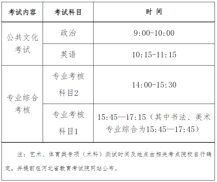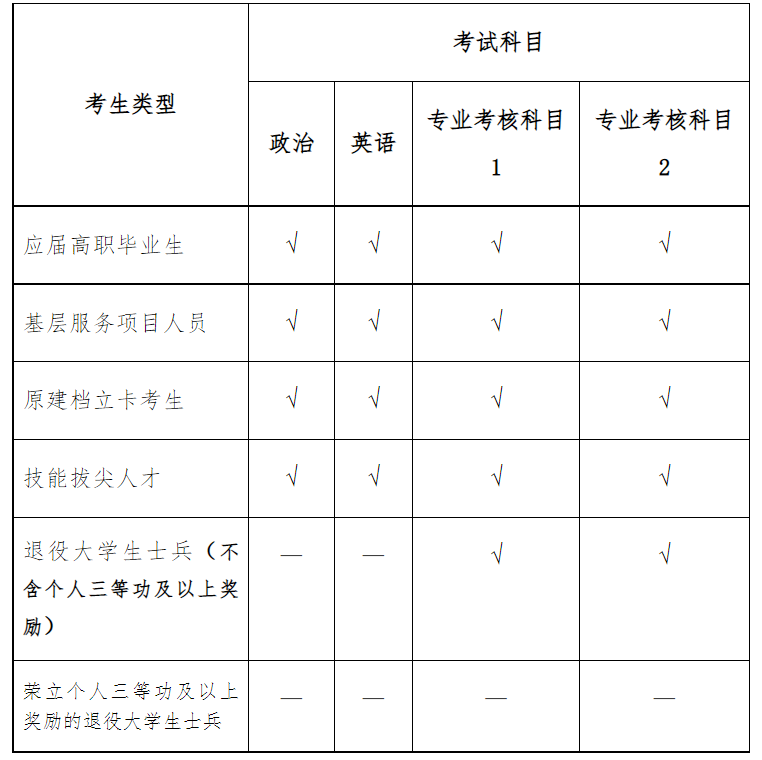 按照《河北省教育厅关于优化调整河北省普通专升本考试科类及科目设置的通知》(冀教学〔2023〕19 号)要求,普通专升本考试科目设公共文化考试和专业综合(职业适应性)考核(简称“专业综合考核”,下同)两部分,总分500分。公共文化考试包含政治、英语2个科目,每科目满分100分。专业综合考核包含专业考核科目1和专业考核科目2(详见上述通知附件2),每科目满分150分。各类考生具体考试科目如下(‘√’表示需要参加考试,‘—’表示免试):