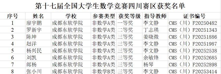 近日,2025年第十七届全国大学生数学竞赛(四川赛区)获奖名单正式公布,我校基础教学学院学生团队凭借扎实的数学功底、出色的逻辑解题能力与稳定的临场发挥脱颖而出,荣获一等奖1项、二等奖1项、三等奖6项,获奖数量与质量较往年均实现新的突破。