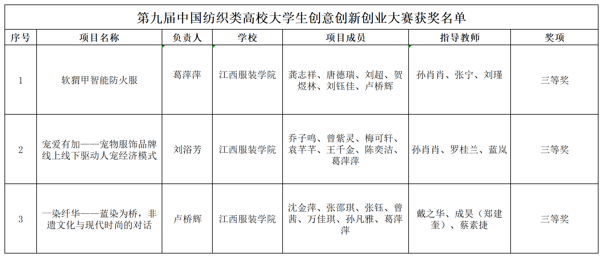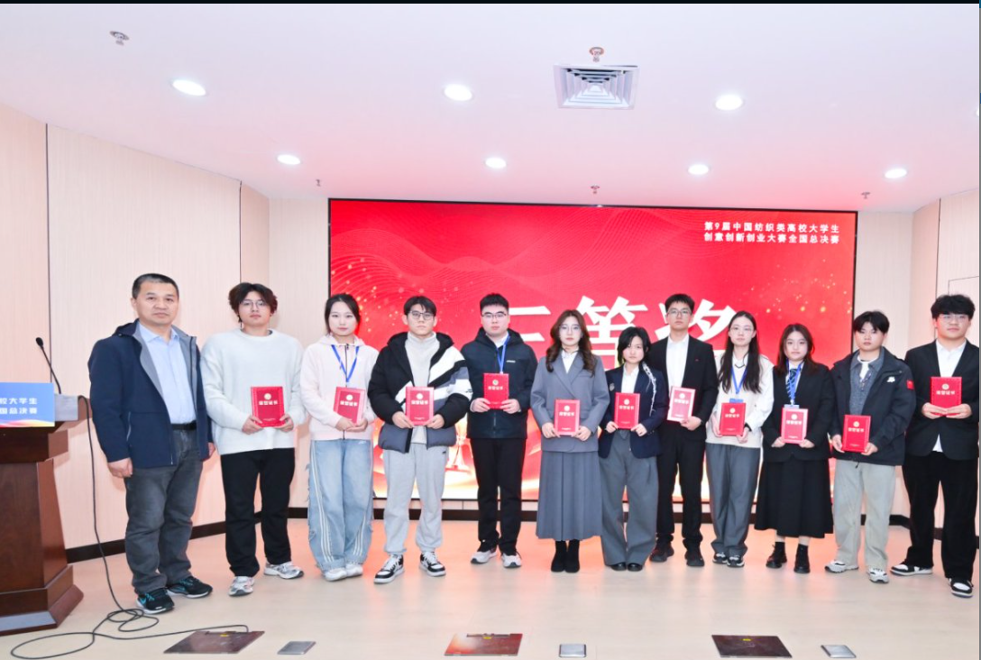 新闻中心讯(文字/ 樊翔)近日,第九届中国纺织类高校大学生创意创新创业大赛全国总决赛在青岛大学圆满收官。作为纺织服装领域极具影响力的双创赛事,本届大赛吸引了全国近30所高校的206项优质作品同台竞技,经行业专家多轮严格评审,我校三支参赛团队凭借扎实的专业功底、创新的设计理念与完善的实践方案脱颖而出,全部荣获全国三等奖,充分展现了学校在双创人才培养与特色教育领域的丰硕成果。