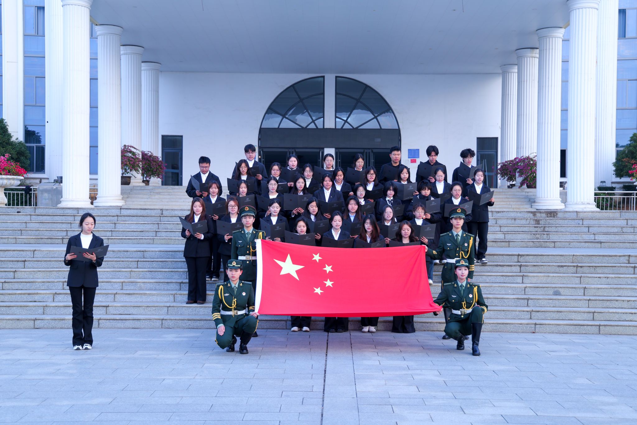 晨读结束后,现场举行了庄严的宪法宣誓仪式。四名校国旗护卫队的学生手持国旗,肃立于前。全体参与人员在社长何一诺的领誓下,面向国旗,高举右拳,郑重宣誓:“我保证,永远忠于中国共产党,忠于祖国,忠于人民……遵守宪法和法律,践行社会主义核心价值观……为中华民族伟大复兴努力奋斗!”誓言铮铮,表达了江服学子忠于宪法、忠于祖国、忠于人民的坚定信念,以及刻苦学习、报效社会的青春担当。