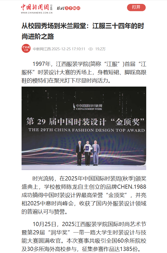 1997年,江西服装学院(以下简称“江服”)首届“江服杯”时装设计大赛的T台上,身着短裙与高跟鞋的模特在聚光灯下迸发出时尚魅力。星移斗转,在2025年中国国际时装周(秋季)颁奖典礼上,江服创建的服装品牌CHEN.1988斩获中国时装设计领域的最高荣誉“金顶奖”并亮相2025中意时尚峰会,赢得中外服装设计界的广泛赞誉。从校园T台到国际时尚殿堂,这所专注于服装领域的特色学府,走出一条服饰文化出海的时尚之路。