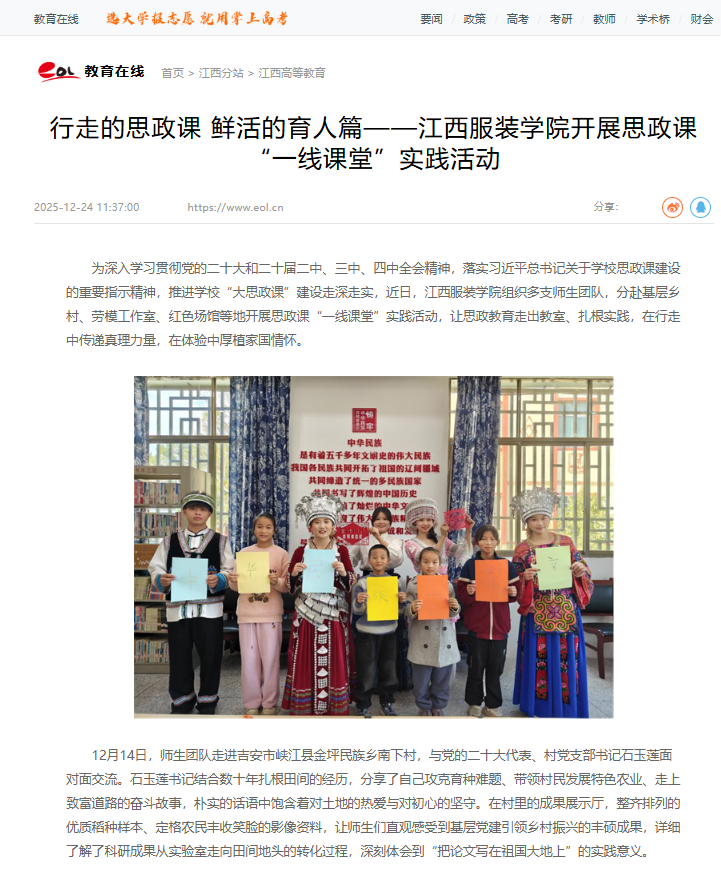 为深入学习贯彻党的二十大和二十届二中、三中、四中全会精神,落实习近平总书记关于学校思政课建设的重要指示精神,推进学校“大思政课”建设走深走实,近日,江西服装学院组织多支师生团队,分赴基层乡村、劳模工作室、红色场馆等地开展思政课“一线课堂”实践活动,让思政教育走出教室、扎根实践,在行走中传递真理力量,在体验中厚植家国情怀。