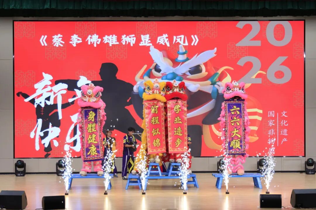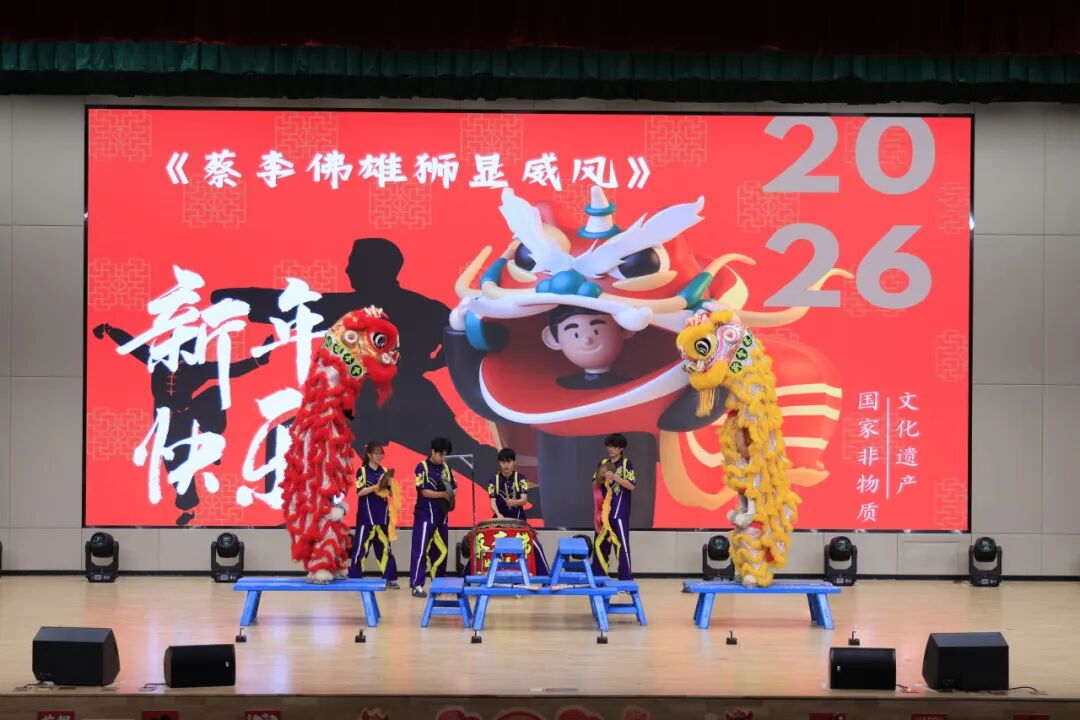 大礼堂内座无虚席,现场观众手持荧光棒,期待着这场盛宴的开启。暖场表演《蔡李佛雄狮显威风》率先登场,蔡李佛拳陈建新团队将岭南传统武术与醒狮表演完美结合,刚劲的动作、灵动的狮舞瞬间点燃现场气氛,锣鼓声中,新年的喜悦与校区的活力扑面而来。