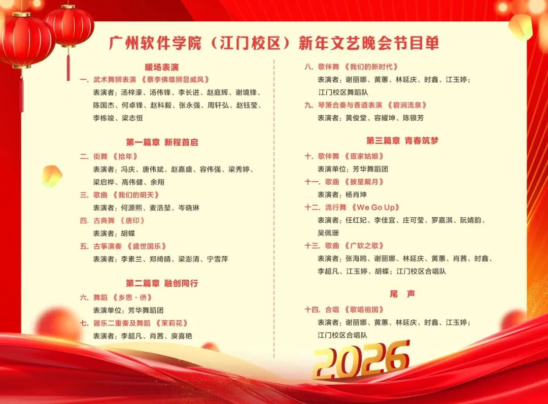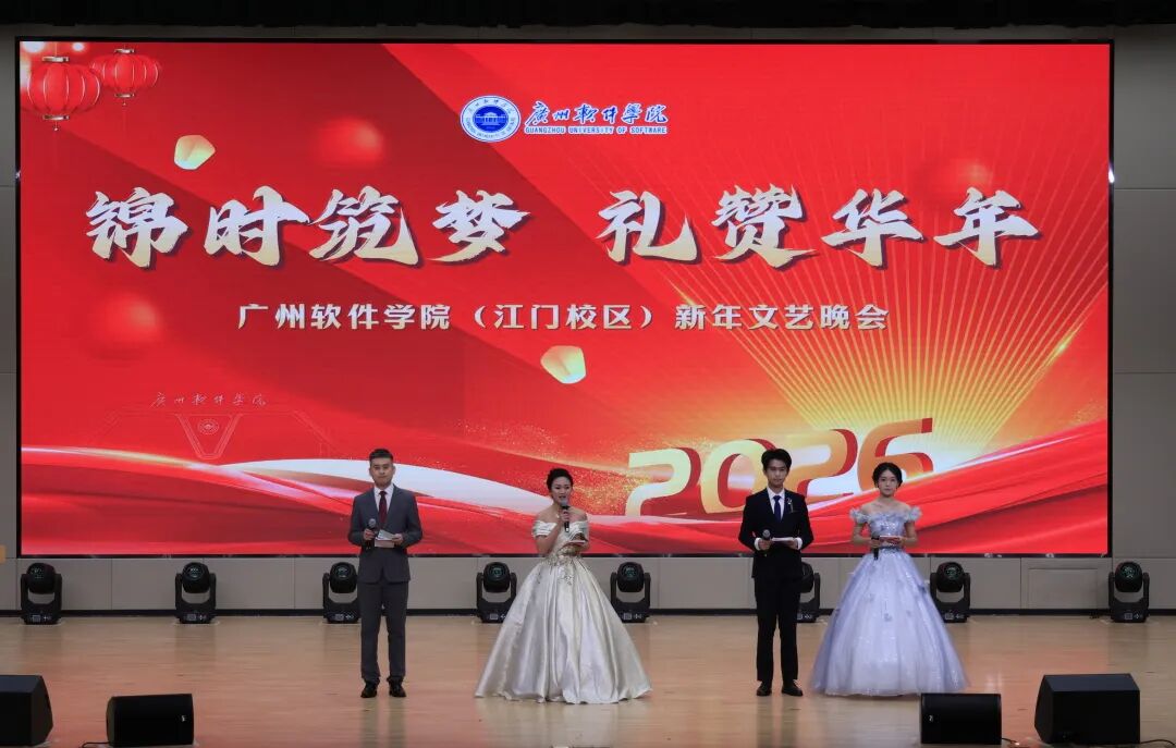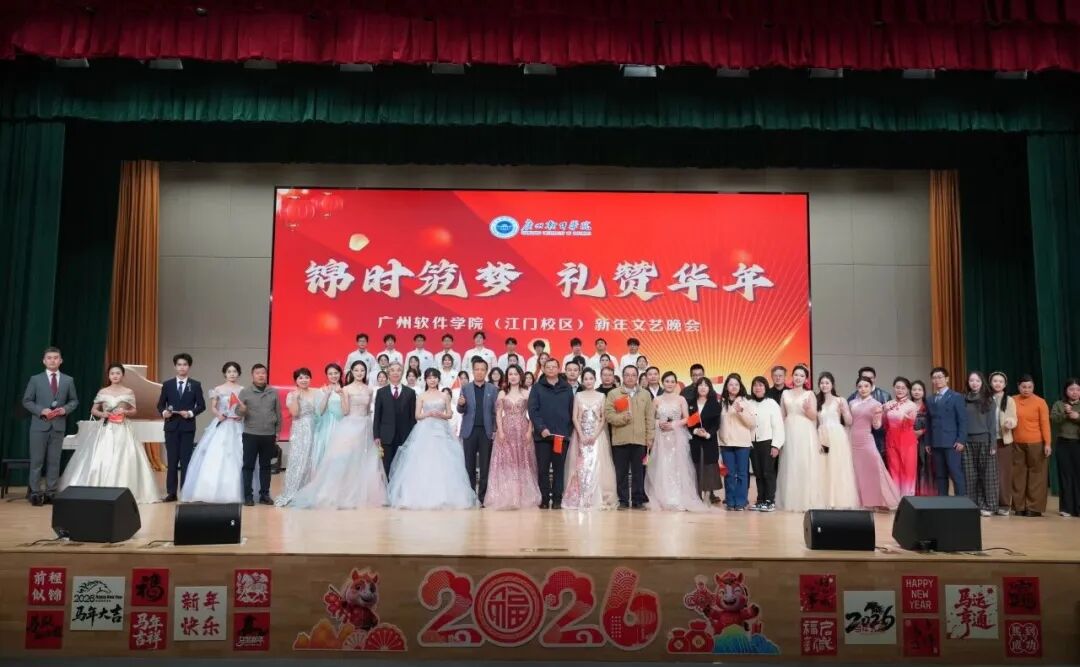 晚会上的欢声笑语仍在大礼堂的穹顶间回荡,演员们挥手谢幕的身影、观众席中不停挥舞的荧光棒、云端直播间近万个点赞共同将这个冬夜定格成江门校区初创岁月里最温暖的画面。舞台的灯光虽已暗下,师生间的暖意却从未消散,2026年,让我们继续相聚在广软的校园里,以艺术传递美好,以青春奔赴山海,一同解锁更多属于我们的温暖瞬间与成长惊喜!