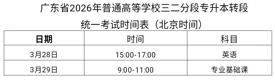 1.普通高校转段招生的统一考试科目为两门,一门公共基础课和一门专业基础课。统考科目与普通专升本统考科目统一命题,统一考试,统一评卷。公共基础课为英语(外国语言文学类中非英语类专业的公共基础课由招生院校自行组织),专业基础课根据专业的不同要求分别为大学语文、高等数学、管理学、教育理论、艺术概论、民法、生态学基础、生理学,三二分段专升本转段试点本科高校名单、试点招生专业及对应的专业基础课详见《广东省2026年普通高等学校三二分段专升本转段招生高校及专业对应表》(附件1)。