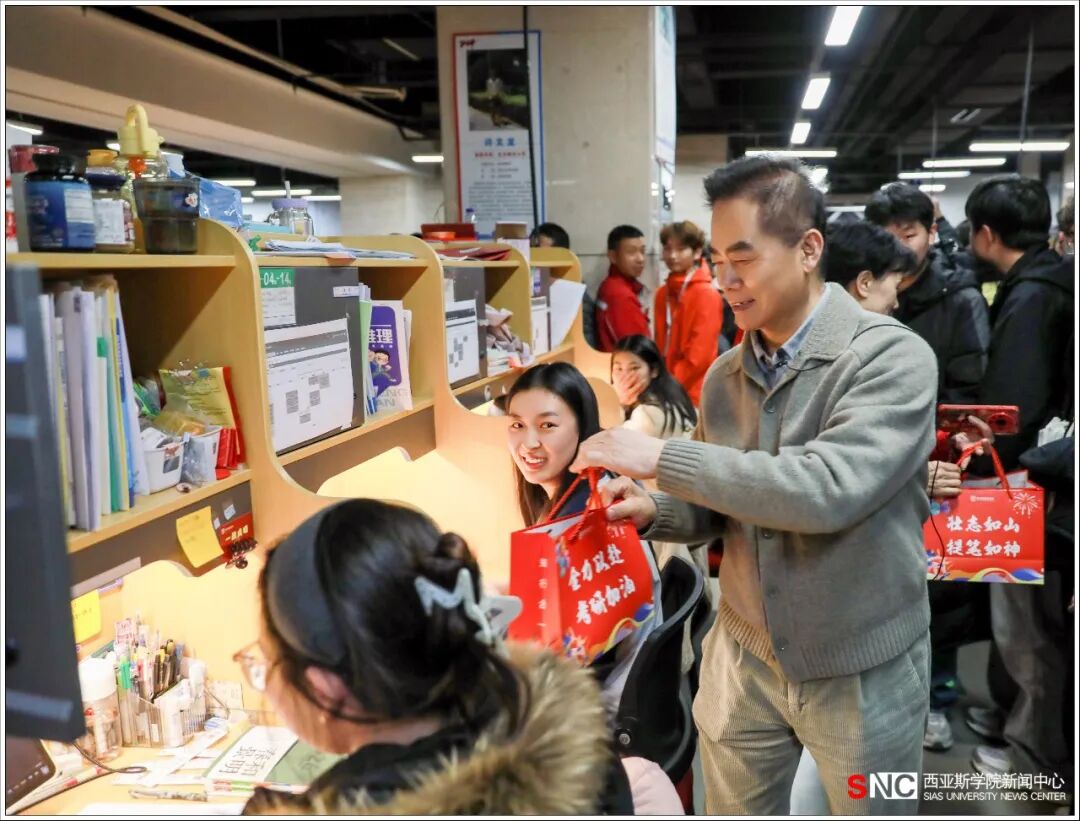 2025年12月16日晚,为缓解考研学子的紧张情绪,我校创办人、理事长陈肖纯博士和校领导在图书馆开展了送温暖活动,为考研学子送去考研助力大礼包,帮助学子们稳定心态、增强自信。