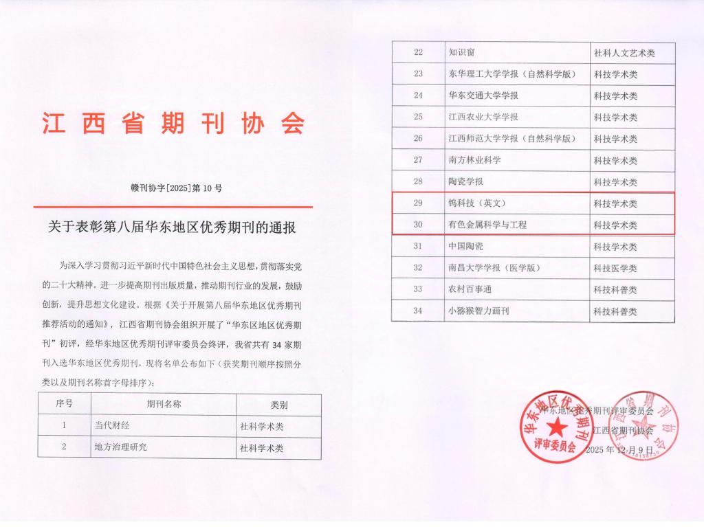 本网讯 近日,江西省期刊协会正式发布通报,我校主办的《钨科技(英文)》《有色金属科学与工程》两本期刊在经过多轮评选后,共同获评“第八届华东地区优秀期刊”和“2025年度江西省优秀期刊”两项荣誉。