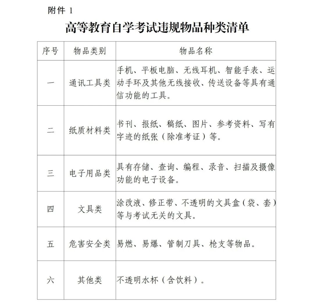 准备考试需要的相关文具,如2B铅笔、黑色字迹的钢笔或签字笔、马克笔、直尺、三角板、圆规、橡皮擦等,除必要文具之外任何物品不准带入考场(《高等教育自学考试违规物品种类清单》见附件1)。严禁携带任何通讯工具(如手机、对讲机及其他无线接收、传送设备)、智能手表、运动手环、电子记事本、电子存储记忆录放设备、照相机、涂改液、修正带等与考试无关的物品进入考场。