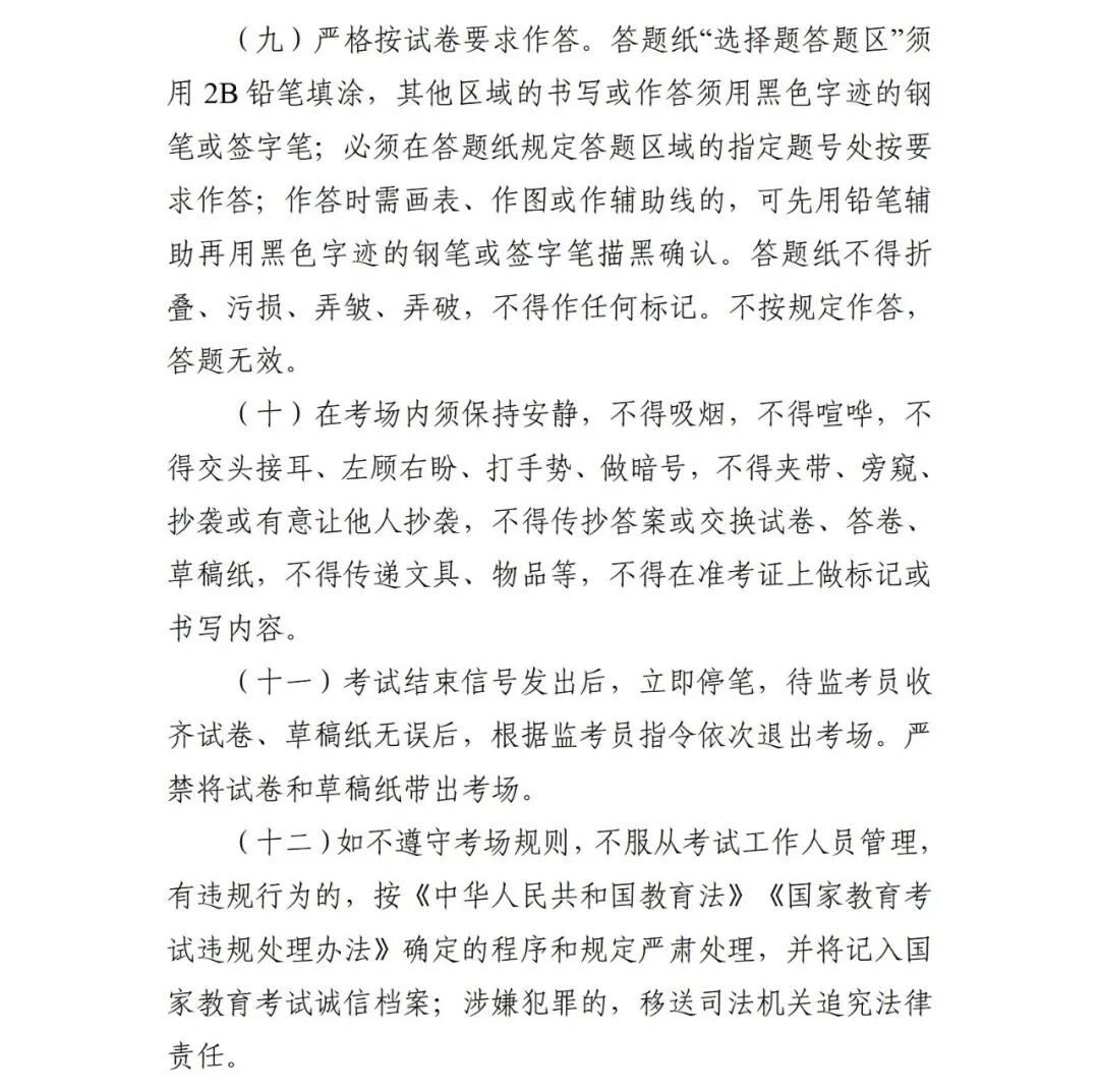 考生须严格遵守有关法律、法规和考试有关规定,诚信考试。如有违规行为,一经查实,将根据《国家教育考试违规处理办法》(教育部令第33号)等规定严肃处理,并记入国家教育考试诚信档案。有组织作弊、提供作弊器材或者其他帮助的;向他人非法出售或者提供考试试题及答案的;代替他人或者让他人代替自己参加考试等行为的,将根据《中华人民共和国刑法》规定追究相关人员法律责任。