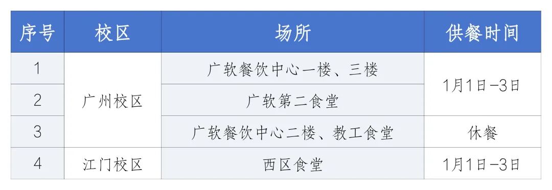 根据国务院办公厅发布的《关于2026年部分节假日安排的通知》,结合广软学院元旦放假安排,现将饮食服务中心元旦假期1月1日至1月3日食堂开餐安排通知如下: