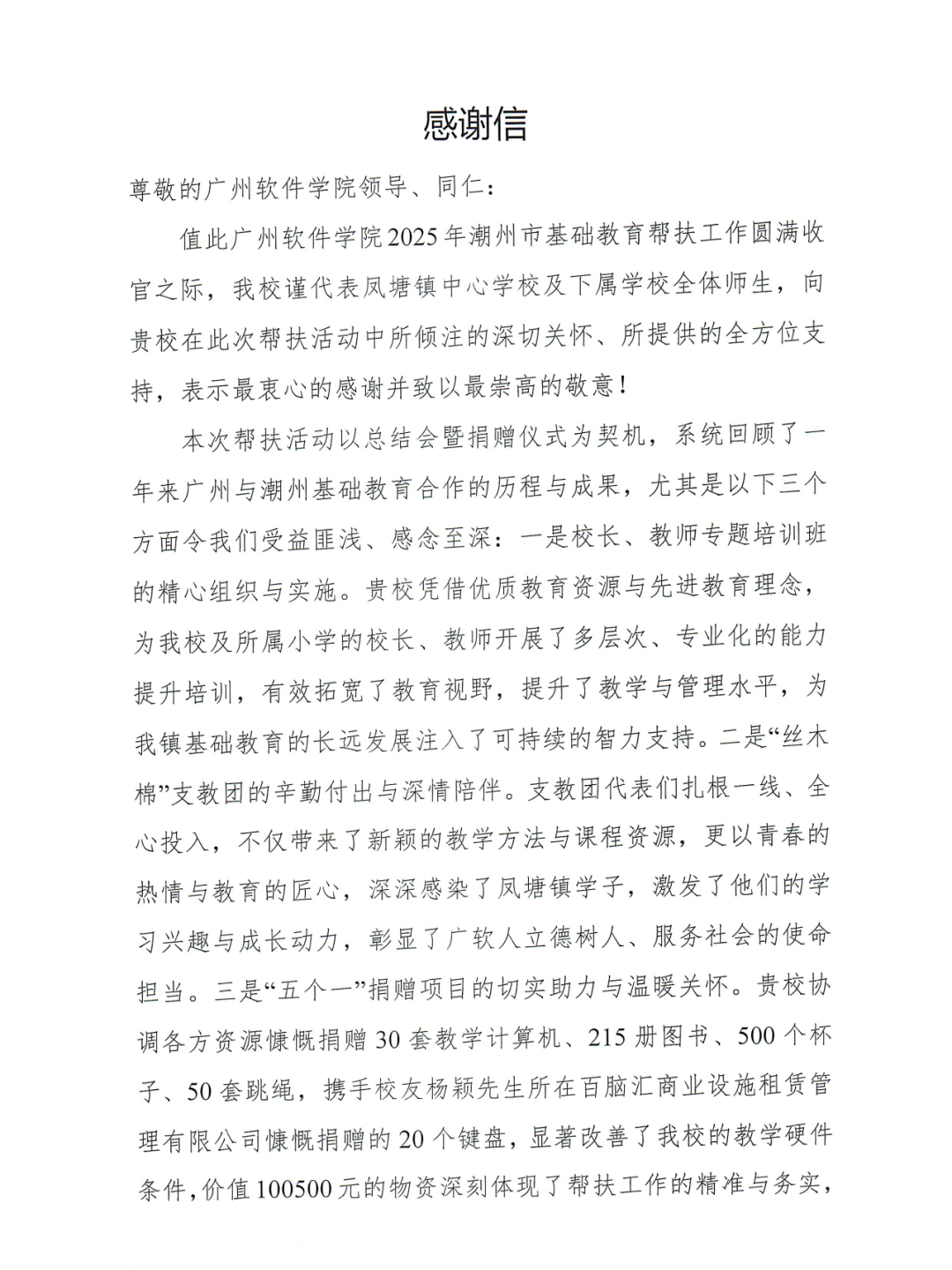 张广金代表学校向凤塘镇中心学校及下属学校捐赠一批教学物资,其中包括教学计算机及配件30套,各类图书215册、陶瓷杯500余个、跳绳等体育用品50套,总价值超10万元,从智力、硬件、资源等多维度夯实帮扶基础。