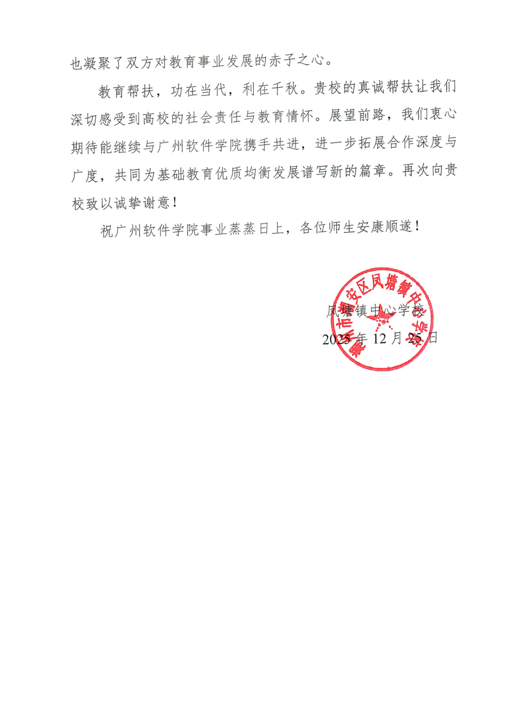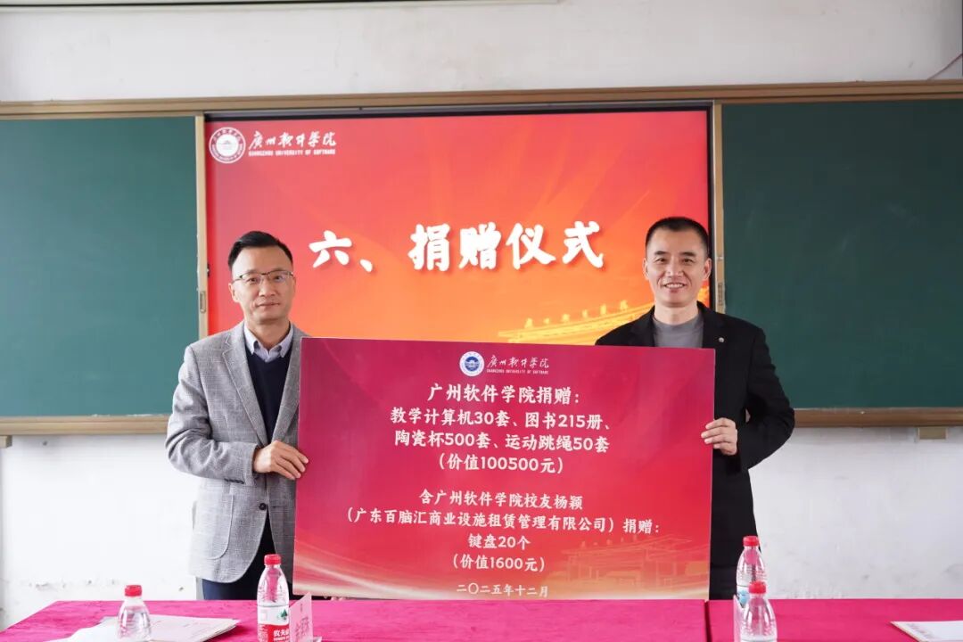 2025年12月25日至26日,学校党委副书记张广金,学校团委、外国语学院等部门负责人,潮州市基础教育帮扶工作小组等教师代表前往潮州开展2025年基础教育帮扶走访调研。12月26日,在潮安区东龙学校举行广州软件学院2025年潮州市基础教育帮扶总结会暨捐赠仪式。凤塘镇中心学校校长陈国礼、东龙小学校长邱文盛、淇园学校校长苏奕忠、义桥小学校长陈小华、凤塘镇中心学校苏贵忠老师出席仪式。