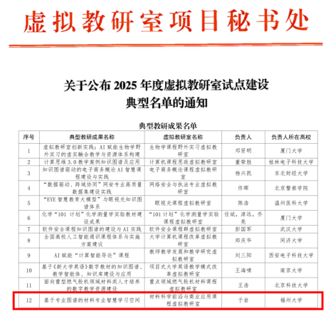 融媒中心讯/近日,受教育部高教司委托,虚拟教研室项目秘书处开展了2025年度典型虚拟教研室、典型教研成果与典型教研方法“三个典型”推荐和论证工作,在全国787个国家级虚拟教研室及其建设成果中,评选出“典型虚拟教研室”50个、“典型教研成果”50项、“典型教研方法”100个。福州大学材料科学前沿与商业应用课程虚拟教研室申报的《基于专业图谱的材料专业智慧学习空间》获评“典型教研成果”。