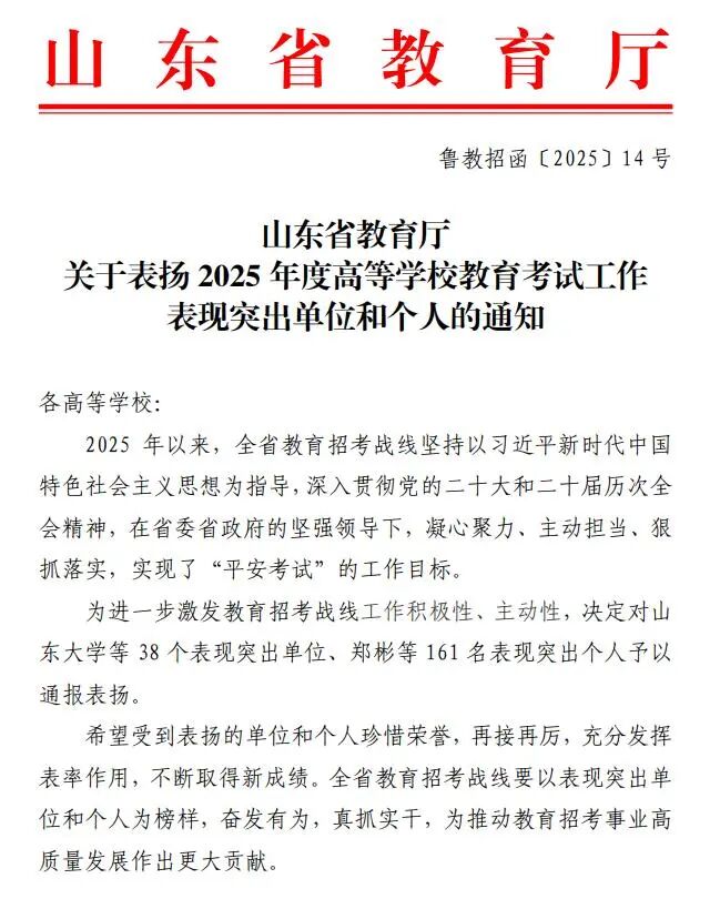 近日,山东省教育厅下发《关于表扬2025年度高等学校教育考试工作表现突出单位和个人的通知》(鲁教招函〔2025〕14号),对在2025年度高等学校教育考试工作中表现突出的单位和个人予以通报表扬。由学院院长李心沁负责的山东特殊教育职业学院团队获得“考试组织工作表现突出单位(团队)”荣誉称号。