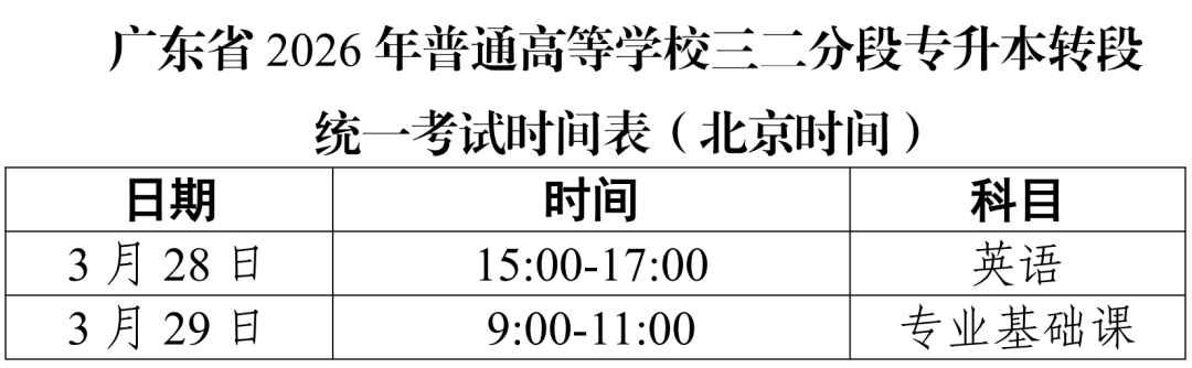 1.普通高校转段招生的统一考试科目为两门,一门公共基础课和一门专业基础课。统考科目与普通专升本统考科目统一命题,统一考试,统一评卷。公共基础课为英语,专业基础课根据专业的不同要求分别为大学语文、高等数学、管理学、教育理论、艺术概论、民法、生态学基础、生理学,三二分段专升本转段试点本科高校名单、试点招生专业及对应的专业基础课详见广东省教育考试院公布的《广东省2026年普通高等学校三二分段专升本转段招生高校及专业对应表》。