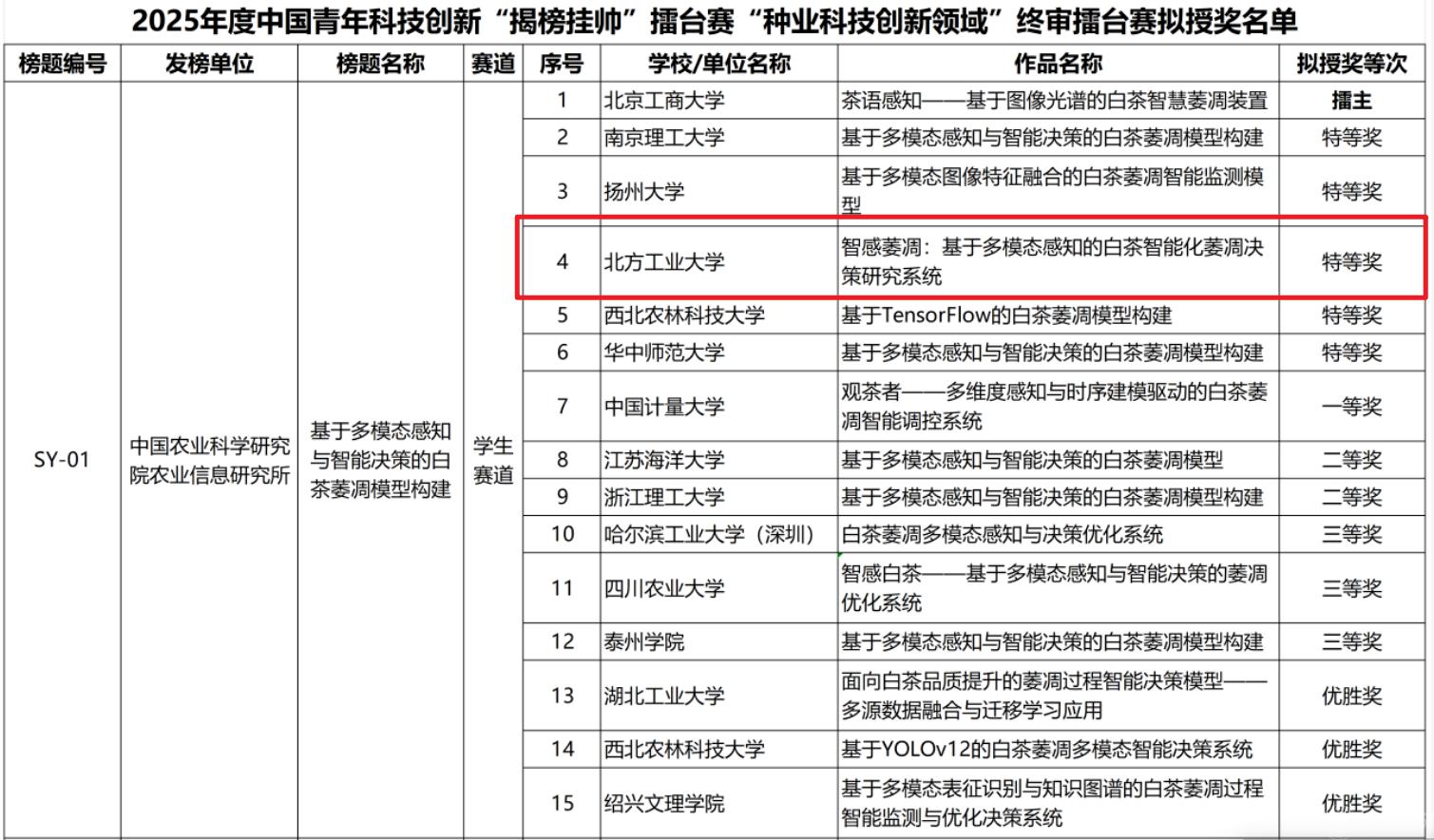 该作品《智感萎凋:基于多模态感知的白茶智能化萎凋决策研究系统》由翟维枫、白传栋、谌奕鹏老师指导,电控学院“塔洛斯实验室”的欧嘉欣、张谷雨、李艳微、张暖、熊信科等5名本科学生组队参赛。团队聚焦白茶加工过程中的关键环节——萎凋工艺,深入研究白茶萎凋过程中的物理化学变化规律,构建了基于温湿度、光照强度、气体成分等多维度参数的智能感知系统,开发了萎凋过程状态识别算法和最优工艺决策模型,能够实时监测茶叶萎凋状态,自动调节环境参数,实现了对白茶萎凋过程的智能化监控和精准决策。该系统能够显著提升白茶加工的标准化水平和产品质量稳定性。