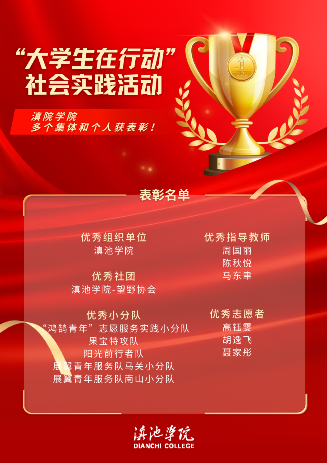 •39支社会实践团队成功入选2025年云南省“大学生在行动”社会实践活动,在该活动中,荣获“优秀组织单位”“优秀社团”“优秀小分队”“优秀指导教师”“优秀志愿者”称号;