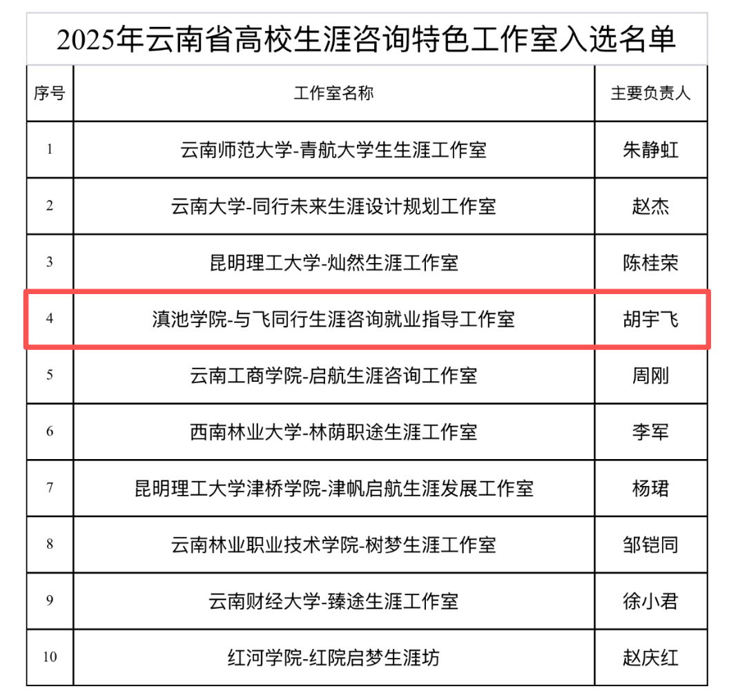 • 与飞同行生涯咨询就业指导工作室获评云南省2025年高校生涯咨询特色工作室;