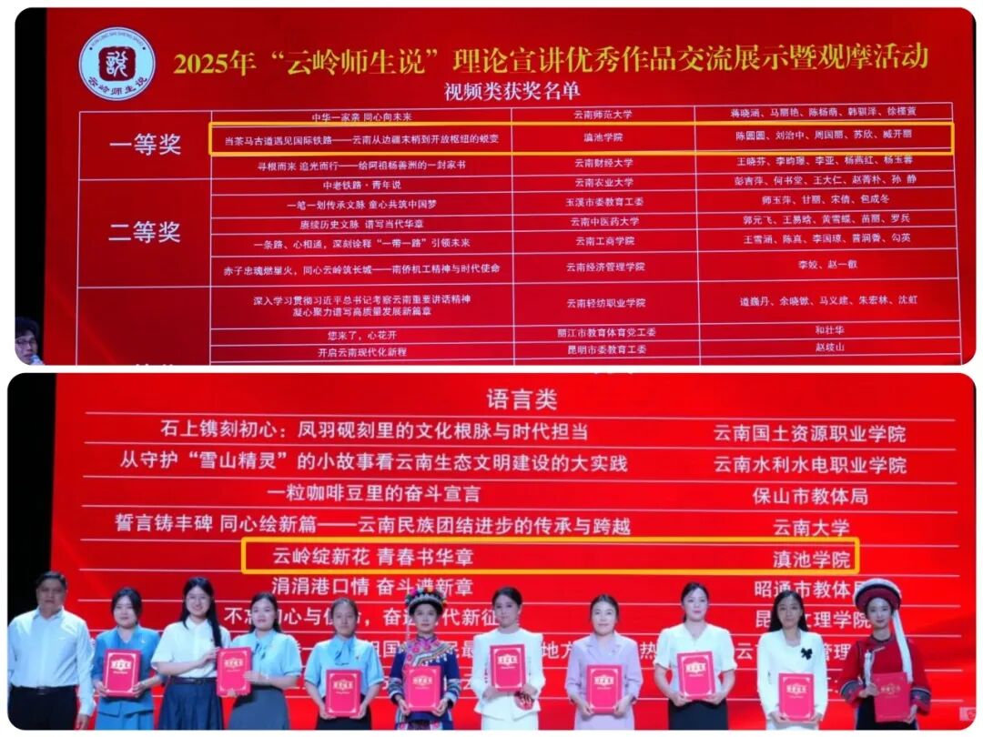 •在云南省2025年“云岭师生说”理论宣讲比赛中,荣获视频类一等奖1项(全省第二)、面对面宣讲语言类三等奖1项、荣获“优秀组织奖”,是全省唯一获奖的民办本科高校;
