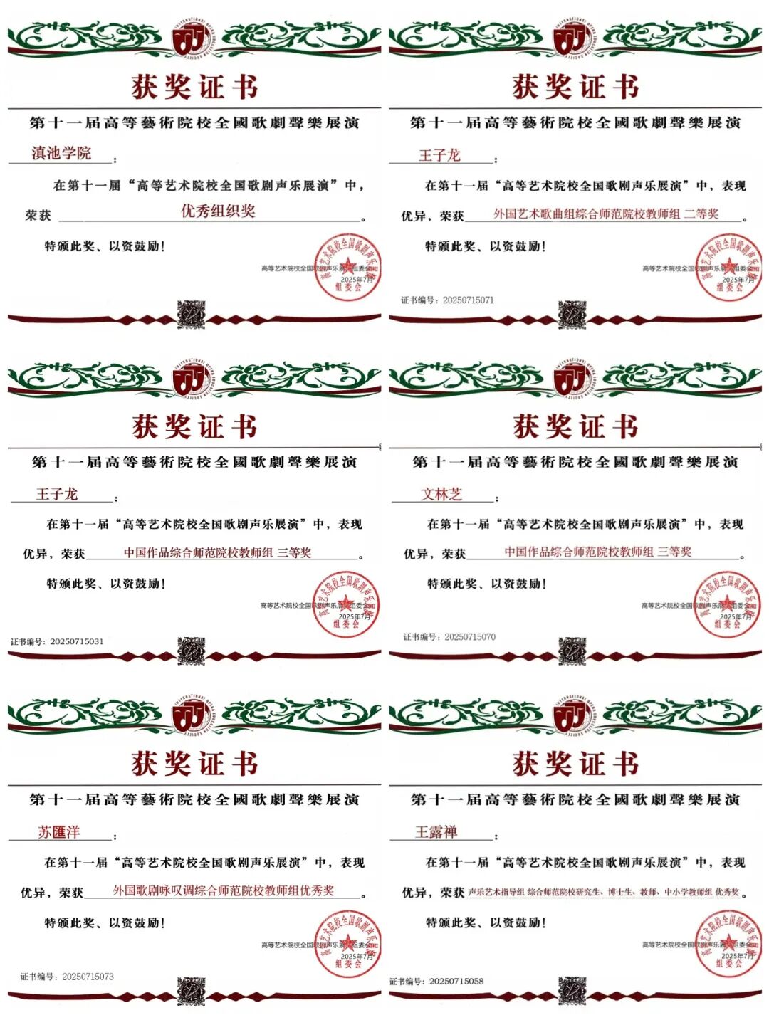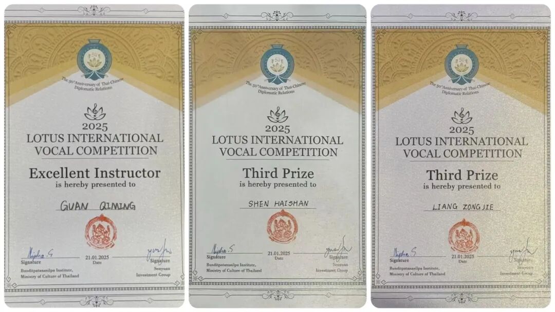 •在2025泰国罗蒂丝国际声乐比赛中斩获成人组艺术歌曲组三等奖、获本科组艺术歌曲组三等奖、获“优秀指导教师奖”;