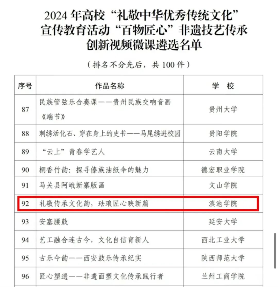 •滇池学院视频微课作品《礼敬传承文化韵,珐琅匠心映新篇》入选“百物匠心”非遗技艺传承创新视频微课遴选名单,其中云南省高校作品入选4件,滇池学院作品是唯一入选的云南省民办高校作品;