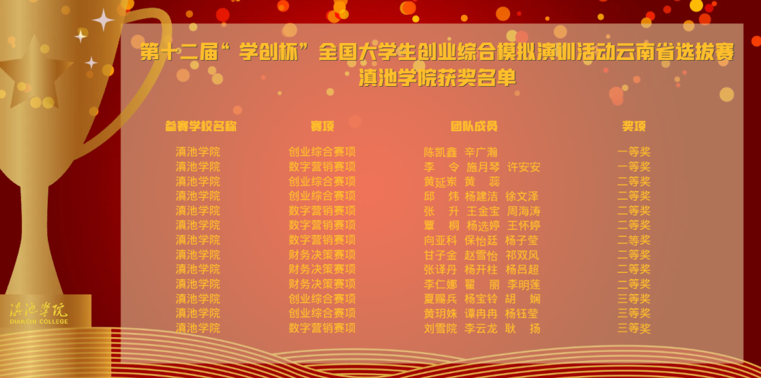• 在第十二届“学创杯”全国大学生创业综合模拟演训活动全国总决赛中,斩获全国特等奖1项、全国二等奖1项,获“优秀组织奖院校”“全国最佳指导教师”称号,在该赛事营销赛道全国特等奖中实现零突破,在云南赛区选拔赛中,斩获一等奖2项、二等奖8项、三等奖3项,总获奖数位列全省高校第一,荣获“优秀学校组织奖”;