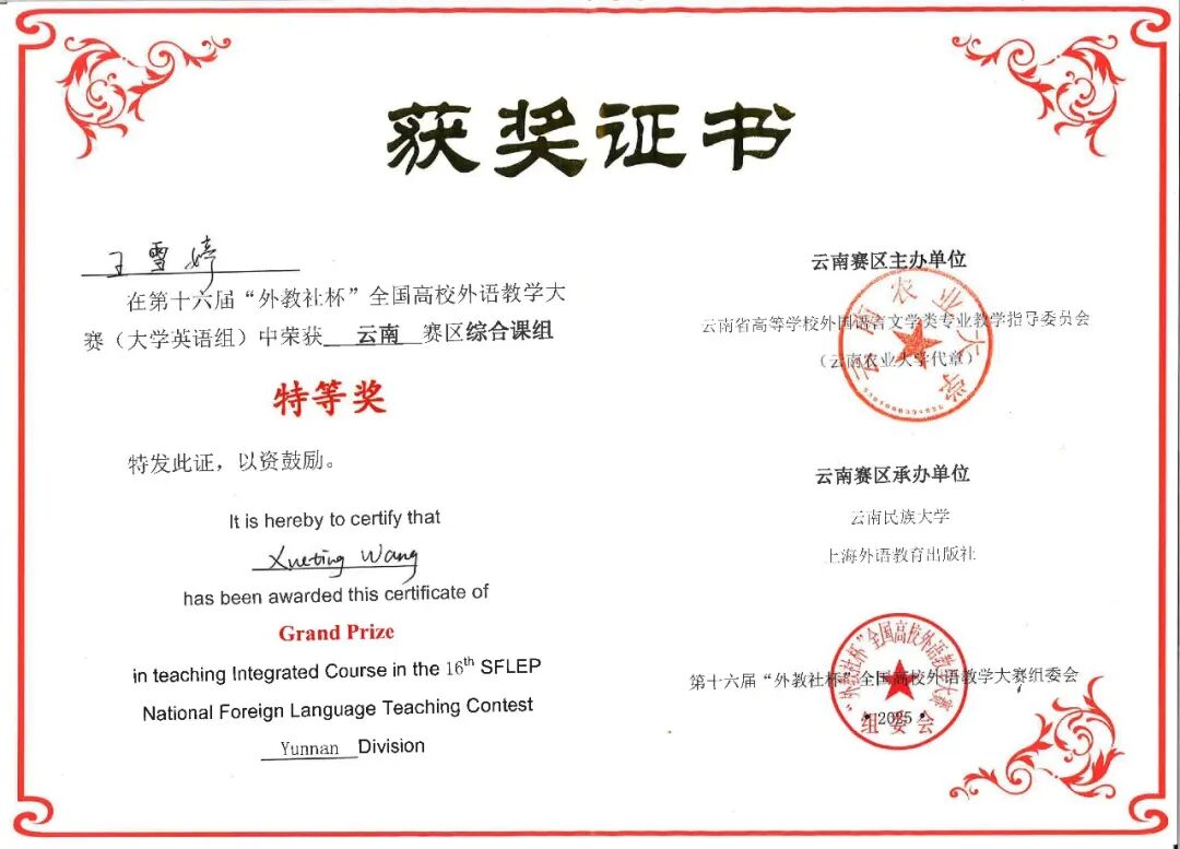 • 在“外教社杯”全国高校外语教学大赛云南赛区斩获综合课组特等奖(此奖项为我校在该项赛事中取得的历史最佳成绩),荣获“优秀组织奖”;