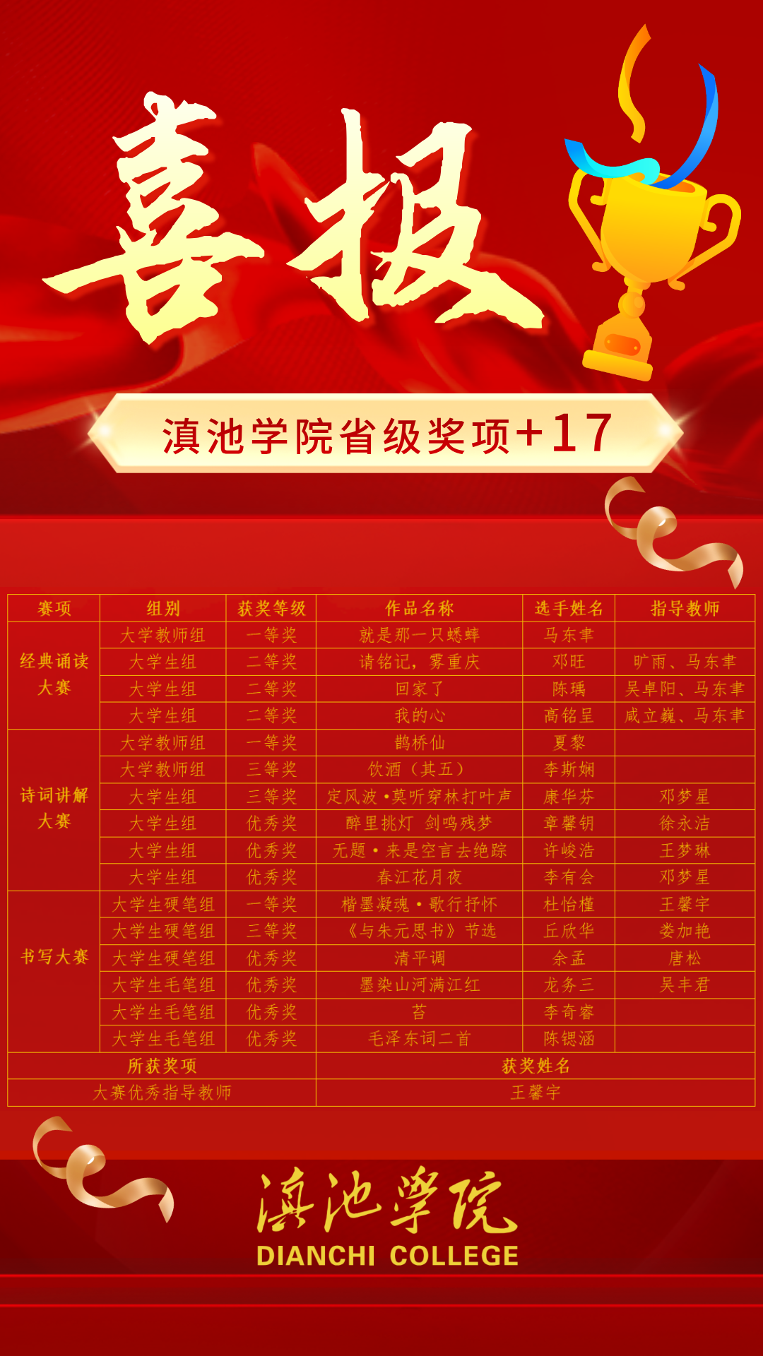 • 在云南省第七届“云岭杯”中华经典诵写讲大赛比赛中,共荣获17项省级奖项,其中一等奖3项、二等奖3项、三等奖3项、优秀奖7项、获“优秀指导教师”1项;