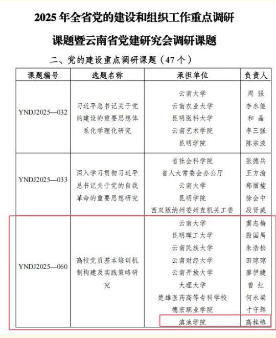 • 党建课题《高校党员基本培训机制构建及实践策略研究》入选2025年云南省党的建设和组织工作重点调研课题;