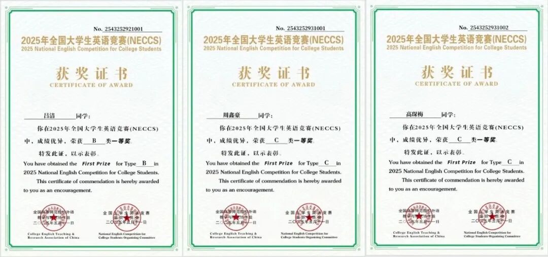 • 在2025年全国大学生英语竞赛中,荣获一等奖3项;