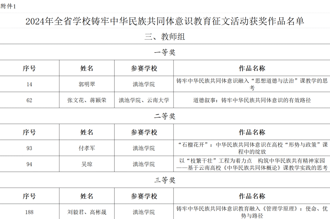 • 在云南省学校铸牢中华民族共同体意识教育征文活动中,选送的优秀论文荣获一等奖2项、二等奖2项、三等奖1项;