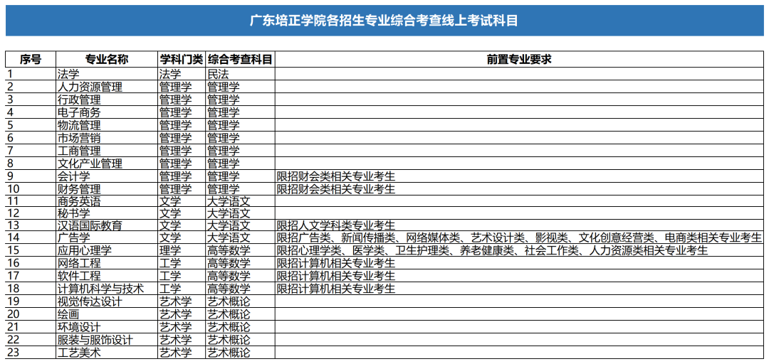 6. 各招生专业综合考查线上考试科目如下表所示: